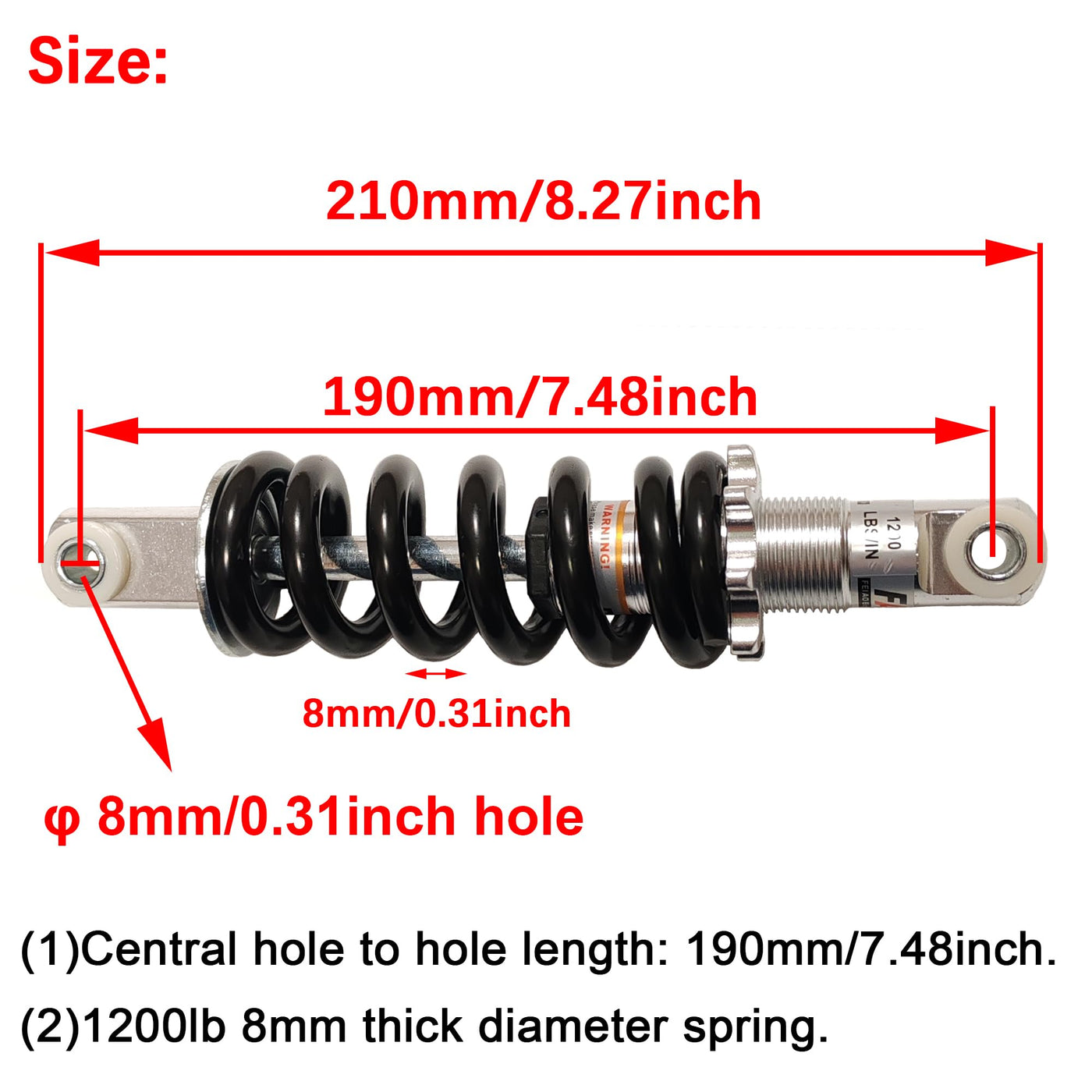 Reference Size: Eye center to center distance is about 190mm/7.48inch. Mounting hole diameter is about 8mm/0.31inch. For 2 Stroke: This 190mm shock damper spring is suitable for 2 stroke quads, buggies, some pit bikes, mountain bike, bicycle, folding bike and more. High Quality Material: This shock absorber is made of high-quality steel material, precision parts, sturdy and durable. Main Function: Shock adjustable damper, shock strut has anti-oxidation and wear resistance, adjustable spring pressure, and a maximum load acity of 1200lbs, which can be improved according to your own riding experience to meet your needs on modified vehicles. Easy to Install: Shock absorber overall replacement parts are easy to install without any modification or drilling, easy to use, original worn shock absorber can be removed and installed directly, saving your time and energy.