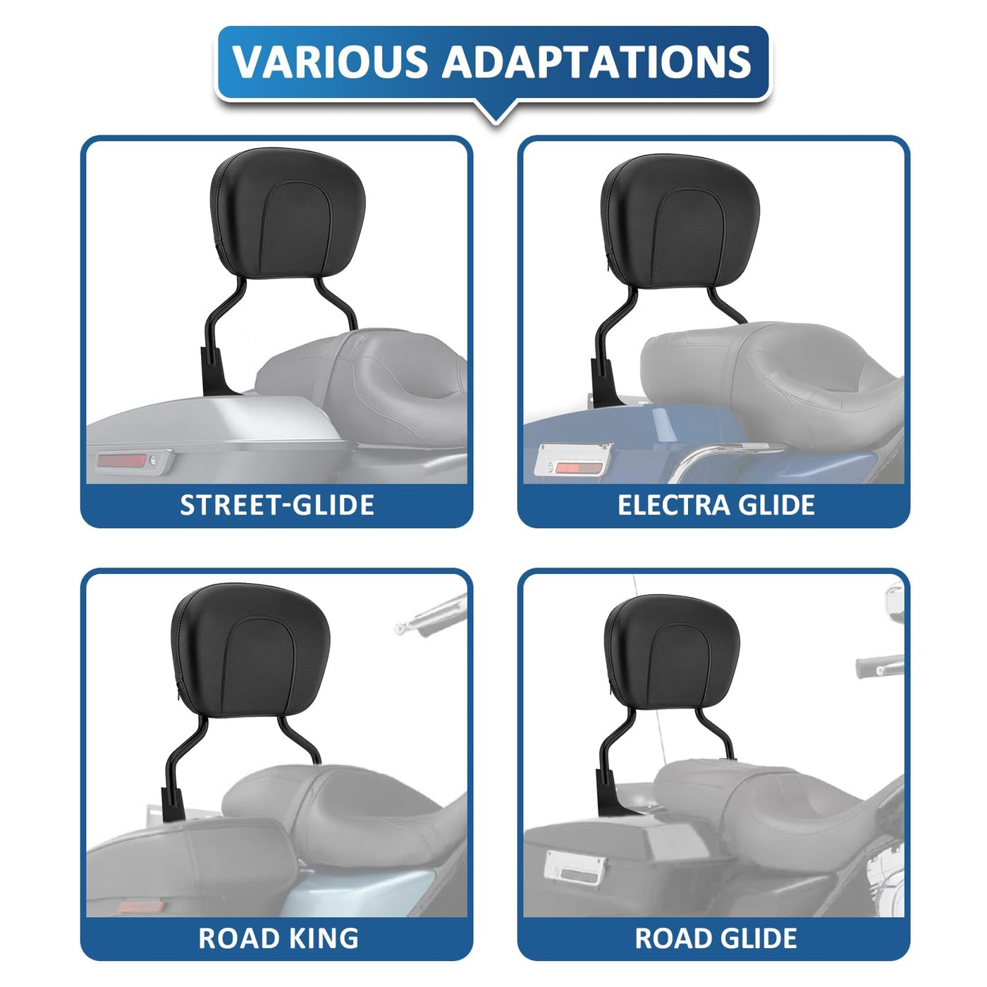 Specifications Item: Passenger Sissy Bar; Docking Hardware Kit Material: Solid Steel Color: Gloss Black Sissy Bar Height: 19 '' Style: Detachable Pad Cushion Material: PU Leather and Polyurethane Foam Process: Triple (copper and nickel plating and black powder coated) Fitment List Compatible with Harley Touring Road King Electra Glide Street Glide Road Glide 1997-2008 (except FLHTCUI and '07-'08 FLHRSE) Compatible with ROAD KING FLHR/I 1997-2008 Compatible with ROAD KING CLASSIC FLHRC/I 1998-2008 Compatible with ROAD KING CUSTOM FLHRS/I 2004-2007 Compatible with CVO ROAD KING FLHRSE 2002-2003 Compatible with ELECTRA GLIDE STANDARD FLHT/I 1997-2008 Compatible with ELECTRA GLIDE CLASSIC FLHTC/I 1997-2008 Compatible with CVO ELECTRA GLIDE FLHTCSE 2004-2005 Compatible with ELECTRA GLIDE ULTRA CLASSIC FLHTCU 1997-2008 Compatible with CVO ELECTRA GLIDE ULTRA CLASSIC FLHTCUSE 2006-2008 Compatible with STREET GLIDE FLHX 2006-2008 Compatible with ROAD GLIDE FLTR/I, FLTRX 1998-2008 Compatible with CVO ROAD GLIDE FLTRSE 2000-2001