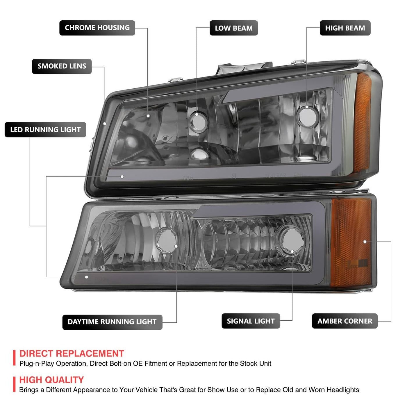A Headlight (Headlamp) Is A Lamp Attached To The Front Of A Vehicle To Light The Road Ahead. Headlight Performance Has Steadily Improved Throughout The Automobile Age, Spurred By The Great Disparity Between Daytime And Nighttime Traffic Fatalities. Headlights Are One Of The Most Important Components Of Your Vehicle; They Allow You To See The Road In Front Of You Clearly During The Night And In Any Bad Weather That May Arise. Our Headlights Upgrade The Face Of Your Vehicle With Clear Style And Extreme Range.