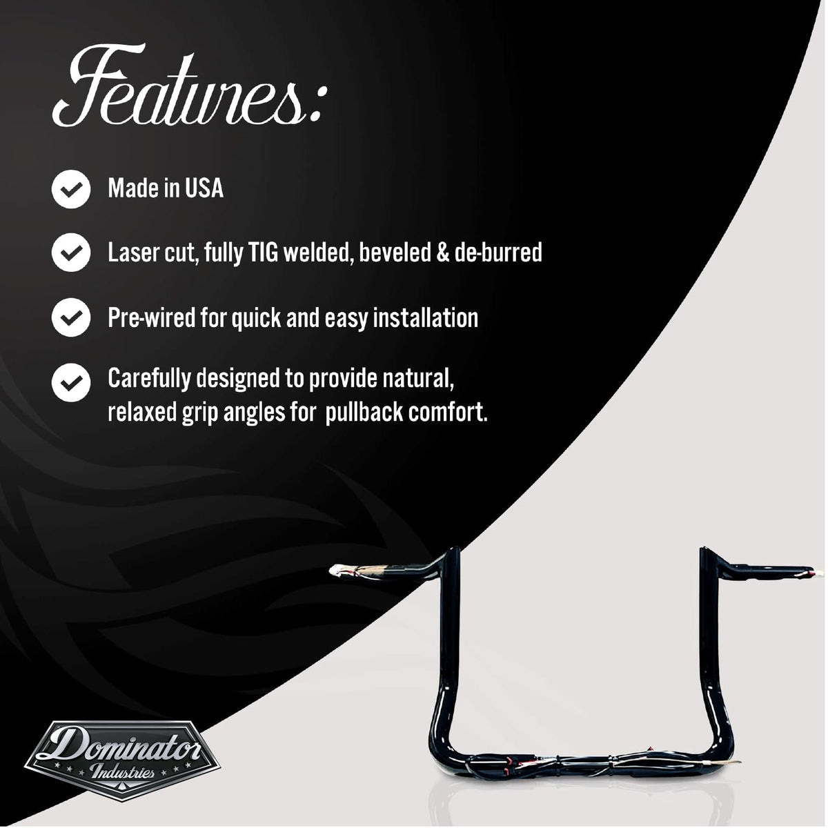 Dominator Industries 1 1/4' Pre-Wired 12' Meathook Bar Ape Hangers Handlebars For 2014-2023 Harley-Davidson Bagger Touring Electra & Street Glide, Special, Ultra Limited, Low (Gloss Black)