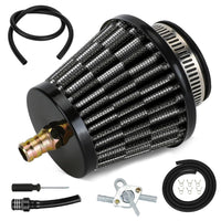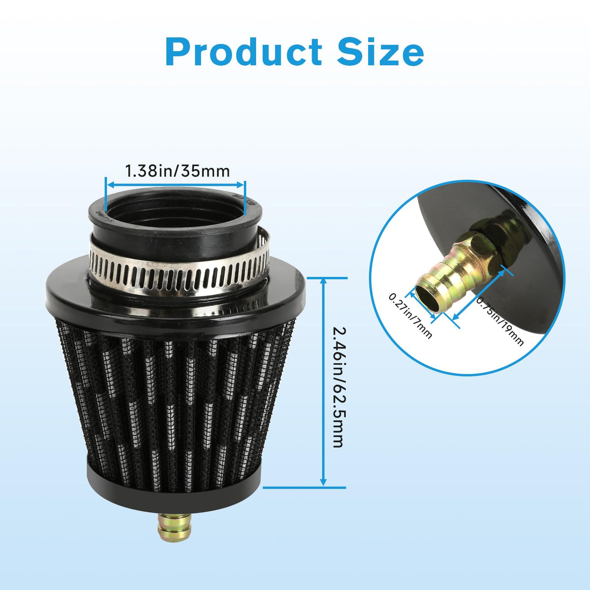 Fitment: 35mm (1-3/8'') air filte* is compatible with PZ19 PZ20 carburetor and most of 50cc 70cc 90cc 110cc 125cc 4-stroke engine Chinese ATV Quad 4 Wheeler Pit Dirt Bike Go Kart Scooter Moped Motorcycle Dune Buggy Mini Chopper, such as Taotao Coolster Apollo Baja SSR Kazuma Roketa Jonway Coleman TrailMaster X-Pro Tank Peace Dongfang Sunl Lifan Zongshen Coolsport Kymco Compatible with: TaoTao 50cc-125cc ATV (Boulder B1, T-Force, ATA-110B, ATA-110D, ATA-110F, ATA-110H, ATA-110L, ATA-125A, ATA-125D, ATA-125F1, ATA-125G, ATA1-125H), Coolster 110cc 125cc ATV (3050B, 3050C, 3050D, 3125B, 3125C, 3125R, 3125X8, 3125XR8), Baja 90cc, X-pro 125cc, Icebear 125cc, Coleman 125cc, Kazuma Falcon90, Buyang, Coolsport, Vitacci 125cc, Arctic Cat 90, Peace Sports 110, Roketa 110 ATV Quad 4 Wheeler Compatible with: Hond* CRF50/ XR50/ CRF70/ XR70, TaoTao DB10/ DB14/ DB17/ DB20/ DB24/ DB27, SSR 110cc, Coolster QG210/ QG213A, Baja Dirt Runner DR49/ DR50/ DR70/ DR90/ Warrior 90, Apollo DB-X4/ Z20, PW80/ TTR125, Coleman 125cc, X-pro 125cc, Lifan 110cc 125cc, Peace Sports Pit Dirt Bike Feature: The 35mm air filte* is made of good quality metal and rubber materials, which can effectively filter sand and dust in the air, ensure the smooth running of the engine and prolong the life of the engine, and this air filte* is equipped with a make-up tube, which can make secondary use of the engine's exhaust gas to make up for the second time, increase the intake, and improve the engine power more than the general air filte* Package Includes: 1 x 35mm (1-3/8'') Air Filte*, 1 x Fuel Line, 6 x Spring Clips, 1 x Fuel Tank Vent Tube, 1 x Petcock Fuel Shut off Valve, 1 x Screwdriver, 1 x Air Supply Tube
