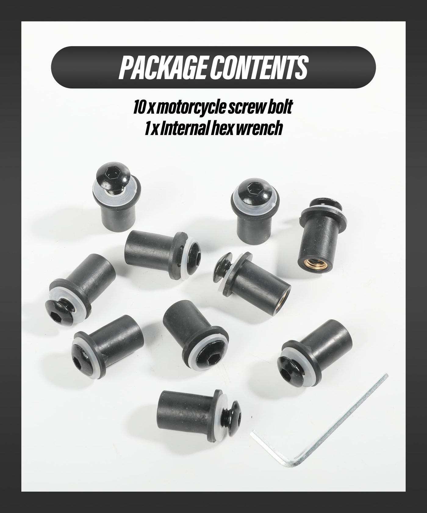 Q: What is included in the ESEWALAS windshield screws kit?A: The kit includes a set of 10 motorcycle windshield bolts and screws along with an M5 wrench, providing everything you need for installation.