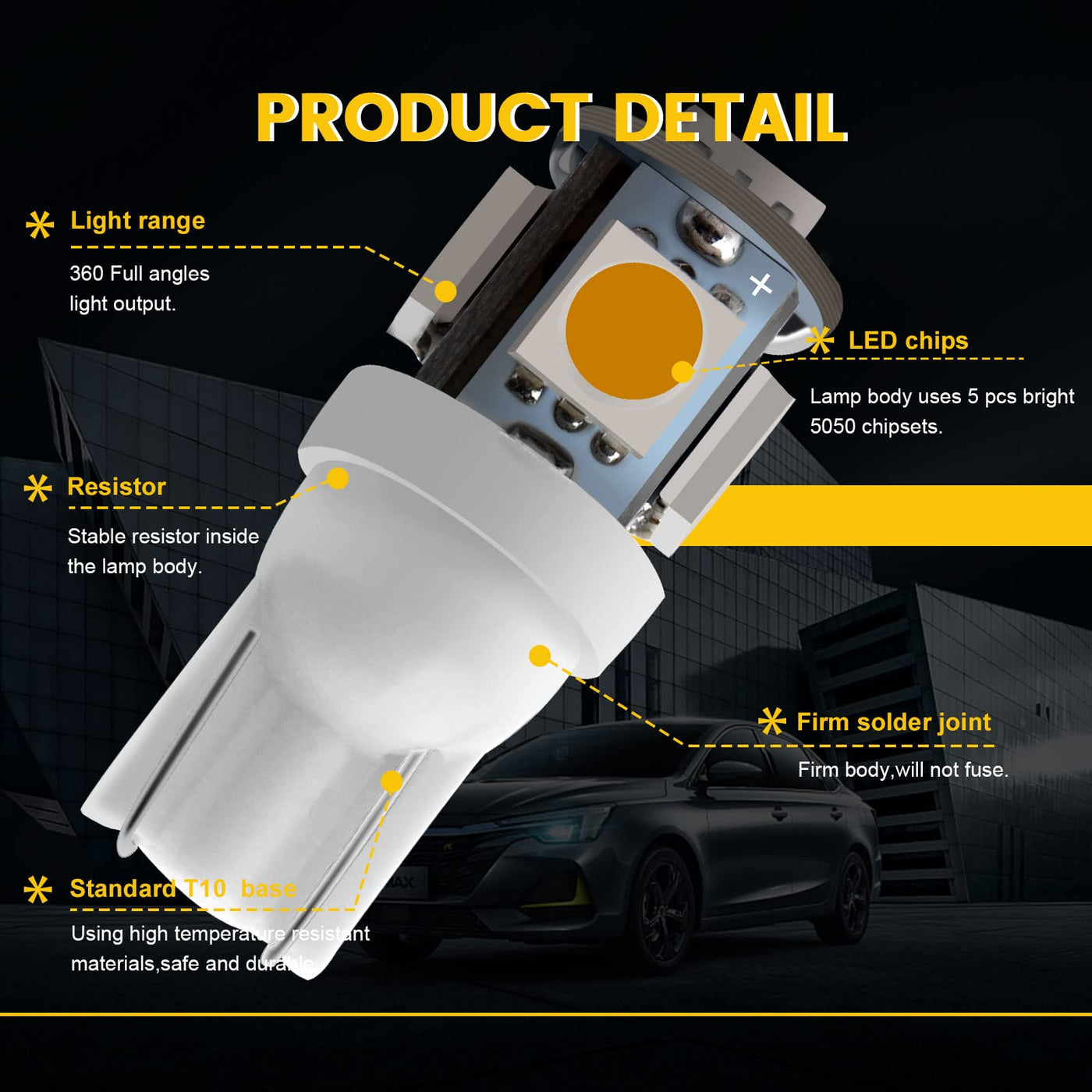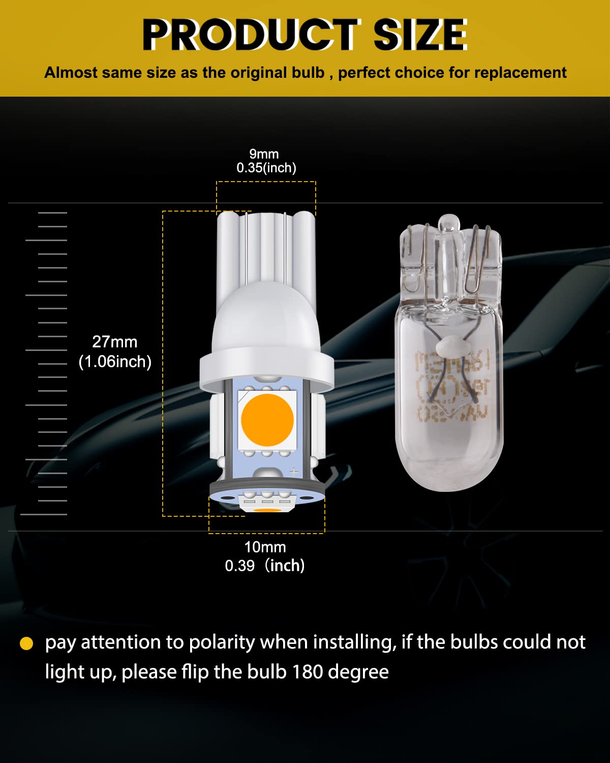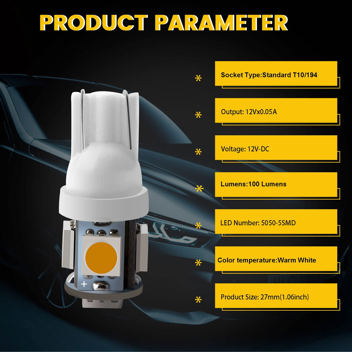 Application: Depending On Your Model, This 194 Led Bulb Can Be Used In Multiple Locations Car Interior Lights As Led License Plate Light, Dome Light, Map Light, Trunk Light, Courtesy Light Ect | Pack Of 20Pcs 194 Bulb! Each T10 194 Led Bulbs Have High Quanlity 5Pcs 5050 Led Chips, Luminous Position Is Transparent Lens, Stronger Astigmatism Effect | Base Type:T10 194 Socket Base, Color:Warm White, Output: 0.06A @ 12V, Lumen: 100 Lumen/Per Bulb, Size:27*10*9 Mm | Fitment: Reference For Stock Bulbs T10, 147, 152, 158, 159, 161, 168, 175, 184, 192, 193, 194 2825 W5W | Note: Pay Attention To Polarity When Installing, If The Bulbs Could Not Light Up, Please Flip The Bulb 180 Degree