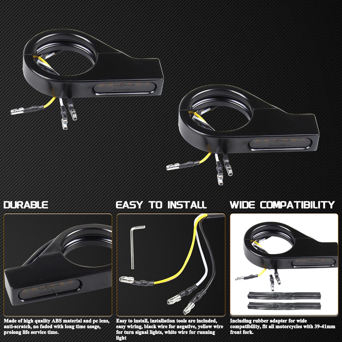 FACAILAHA Motorcycle Front Fork LED Turn Signals Universal Sequential Switchback Running Lights 12V Amber Blinkers W/Mounting Br