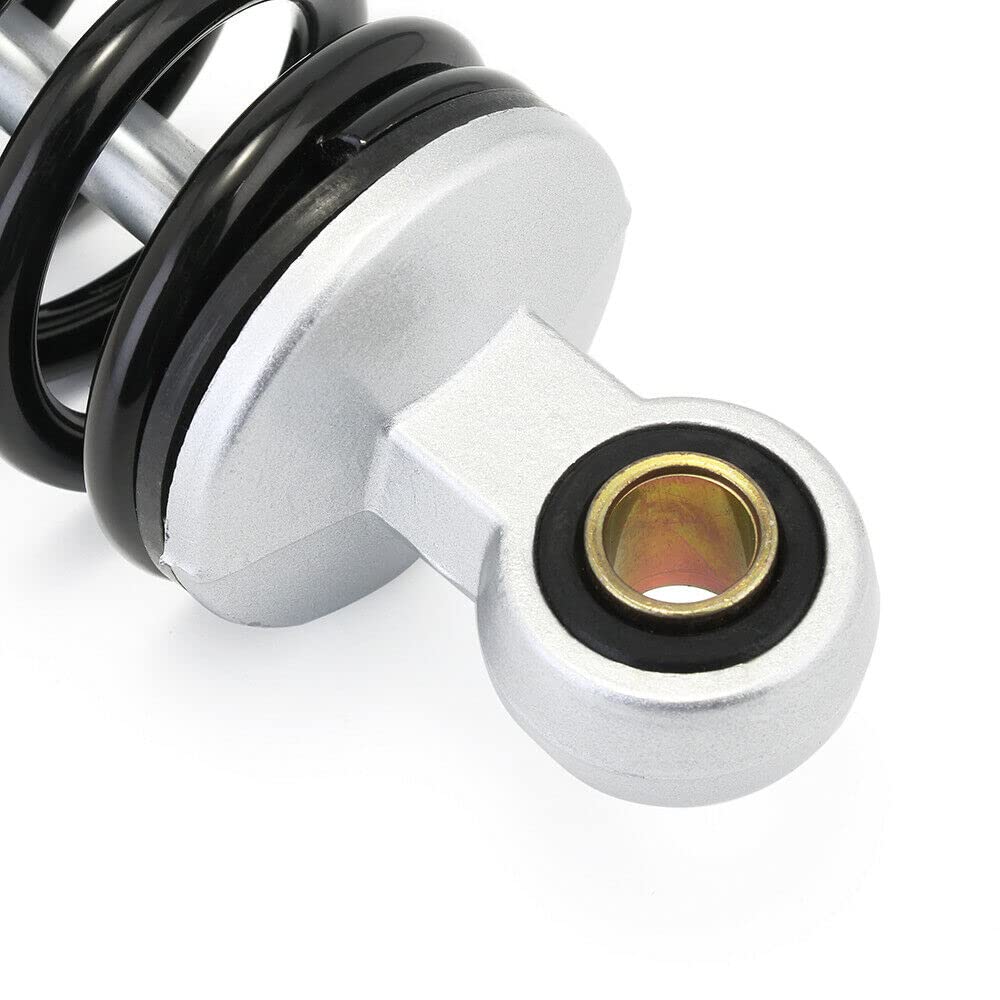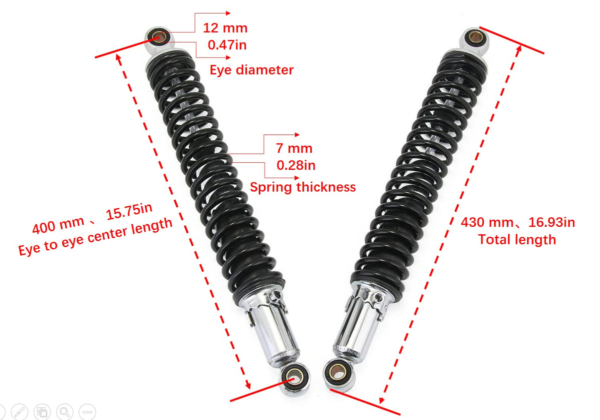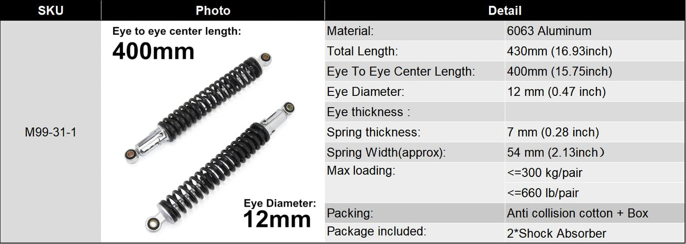 Description:Material: Solid Steel+Aluminium Alloy. Total Length: 430mm (17 inch). Eye To Eye Center Length: 400mm (15.75 inch). Spring thickness: 7 mm (0.28 inch) Max loading:200kg/pair 450lb/pair. The shock absorber is a modified universal type, compatible with most 50cc, 75cc, 90cc, 125cc, 150cc, 250cc, 300cc street cars, off-road vehicles, karts, ATVs, motorcycles and quad bikes.Universal fit for most vehicles, like CBR600RR CBR1000RR CB500 YZF-R1 YZF-R6 YZF-125 XC EXC XCF R800GS R1200GS, etc.