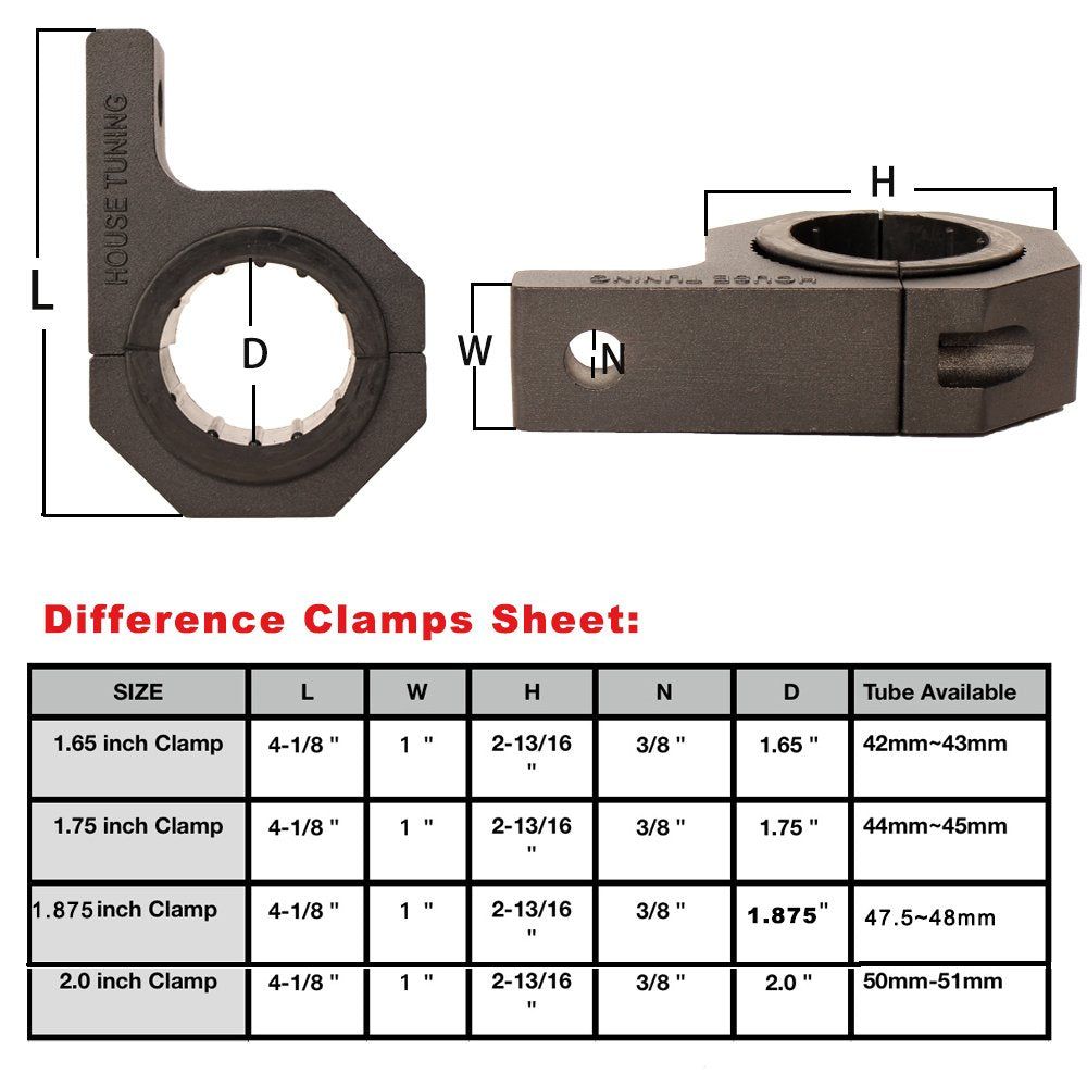 House Tuning Horizontal Bar Clamp Mounting Kit Simplifies The Installation Of The House Tuning Off Road Led Light Bars And Led Driving Light Onto Your Roof Rack, Bull Bar, Or Headache Rack. The Kit Can Be Used For Tubes Sized At 0.75 '',0.875 '',1.0 '',1.125 '',1.25 '',1.5 '',1.625 '',1.75 '',1.875 '',2.0 '' In Diameter. Interchangeable/Compatible: All Sizes Of House Tuning Series Led Light Bars And Pods Lights Features: Simplifies Installation And Small Size Can Be Used On Tubes Of 1.875 '' Inn Diameter. Package Include: 4 X Clamp 4Set X Rubber Insert For 1.875 '' Tube (8Pieces) 1 Set X Mount Screw With Allen Hex Key