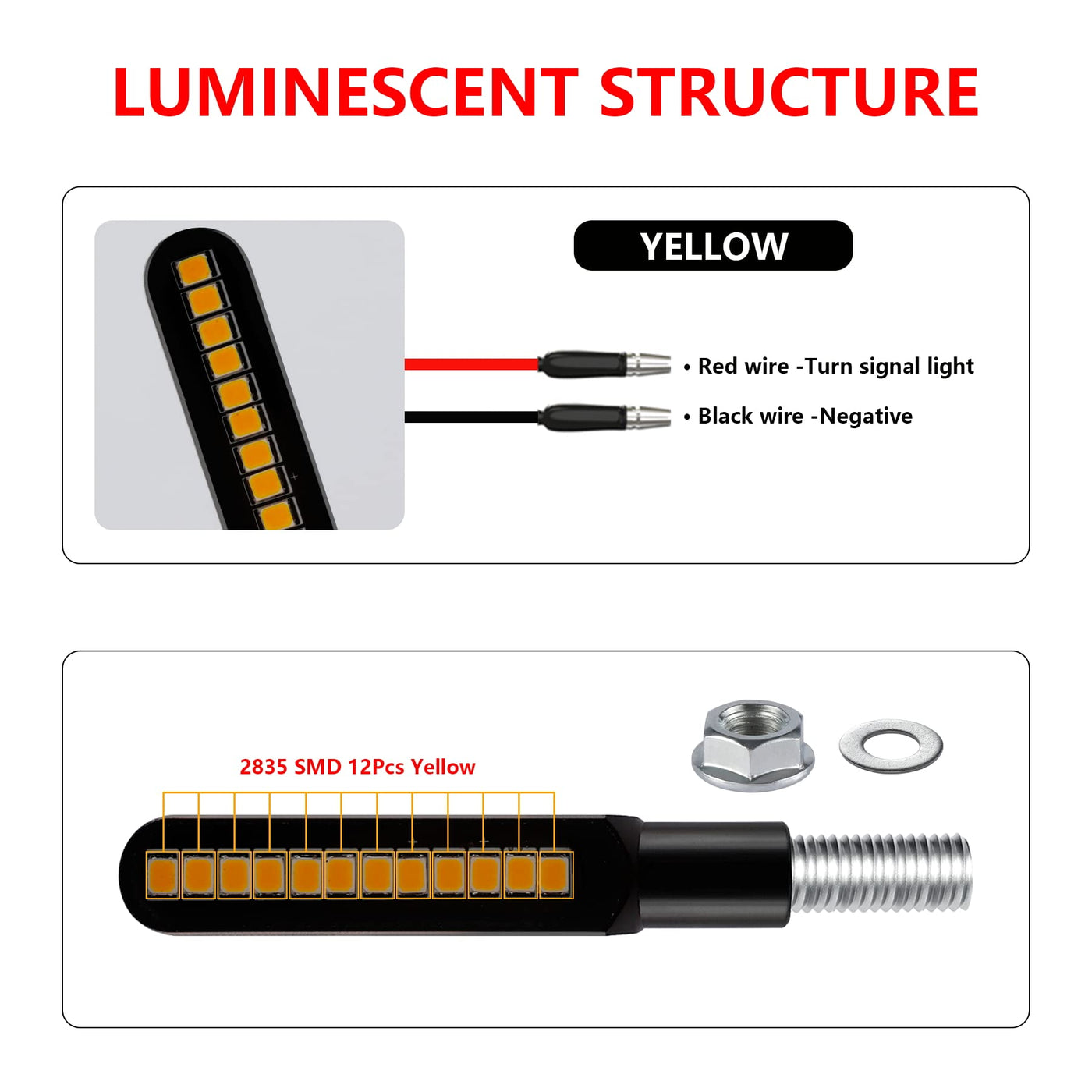 Compatibility: Suitable for most 12V motorcycles. Note: some models require a load resistor or flasher relay when replacing turn signal Light | High Quality: Our product features an aluminum alloy casing that is wear-resistant, shock-resistant, and easy to dissipate heat | IP67 Protection: Waterproof and dustproof, unaffected by harsh weather conditions, and extends the lifespan of the LED | Easy to Install: Black Wire is Negative, Red Wire is Turn Signal Light | Professional Service: We are committed to providing good customer experience, if you have any questions about our product, please do not hesitate to contact us