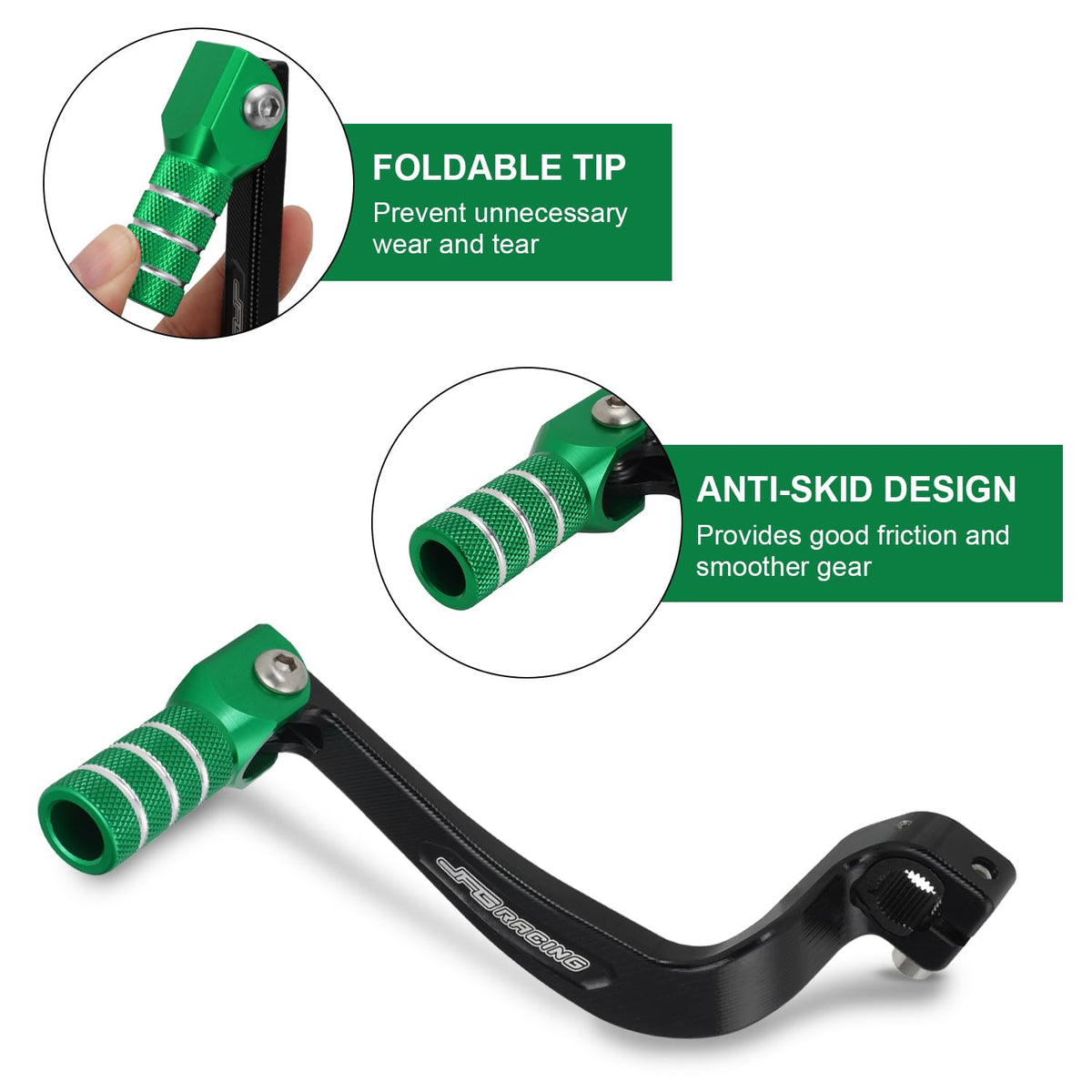 Q: How does the foldable tip feature work on the shifter lever?A: The foldable tip is designed to contract during impacts, such as collisions or falls, preventing unnecessary breaks or damage to the lever, which enhances its durability.