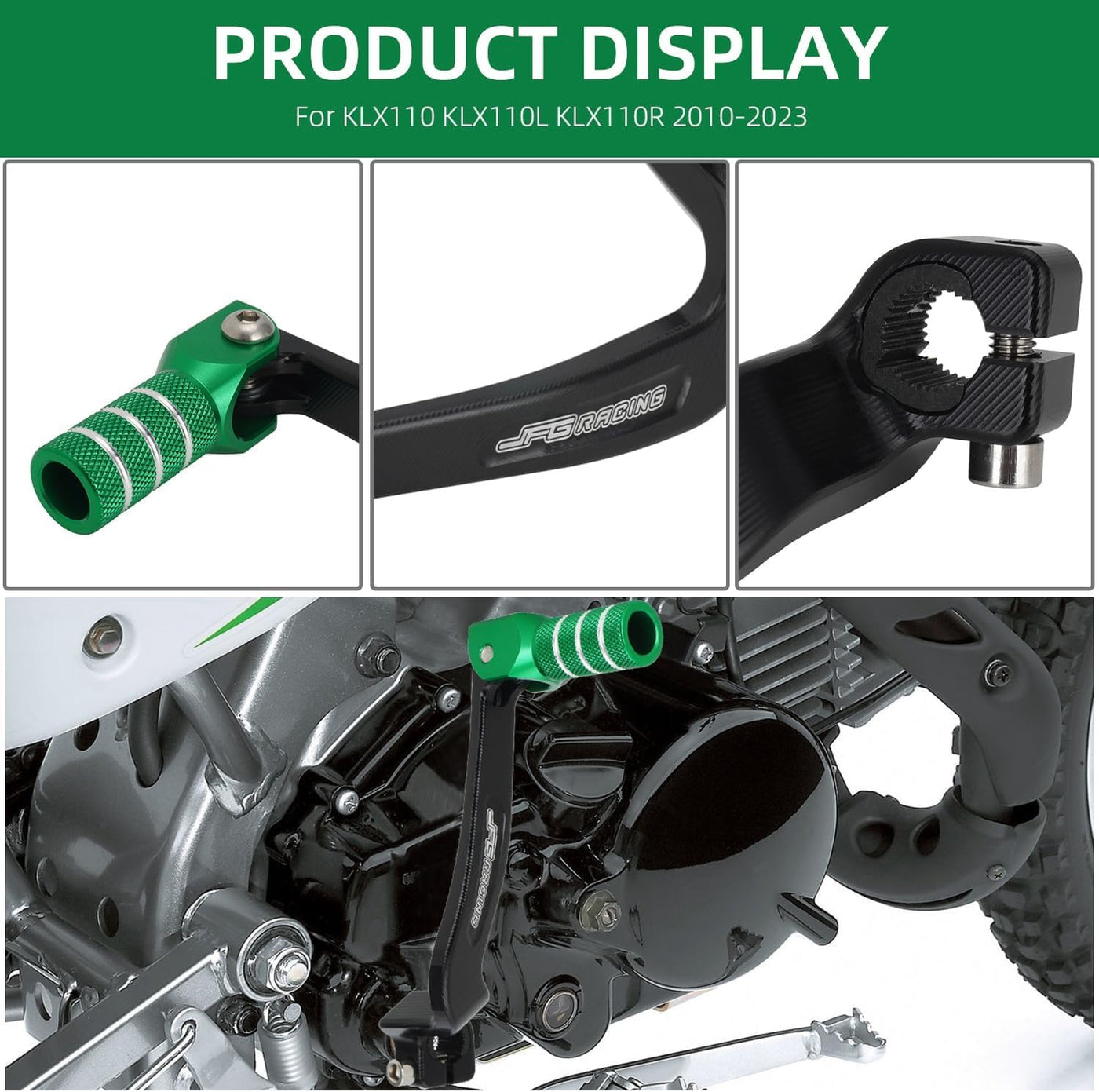 Q: Is the JFG RACING Motorcycle Gear Shifter compatible with KLX110 models from 2010 to 2023?A: Yes, the JFG RACING Motorcycle Gear Shifter is specifically designed for KLX110 and KLX110L models from 2010 to 2023, ensuring a perfect fit and optimal performance.