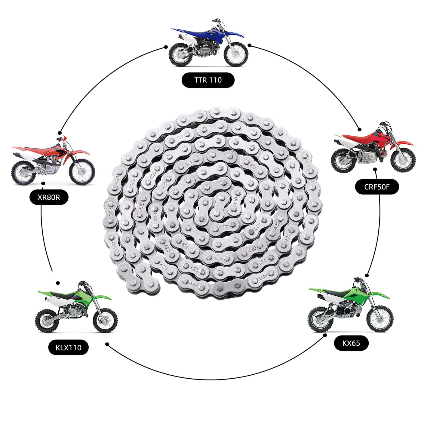 Q: What types of bikes and ATVs is the KAMIER 420 Drive Roller Chain compatible with?A: The KAMIER 420 Drive Roller Chain is compatible with various models, including Hond* CRF50F, XR50R, Kawasak* KLX110, KX65, Yamah* TTR 90, SSR 70, and many more. It's designed for 50cc to 150cc 4-Stroke Engine Chinese Pit Dirt Bikes, ATVs, and Go Karts.