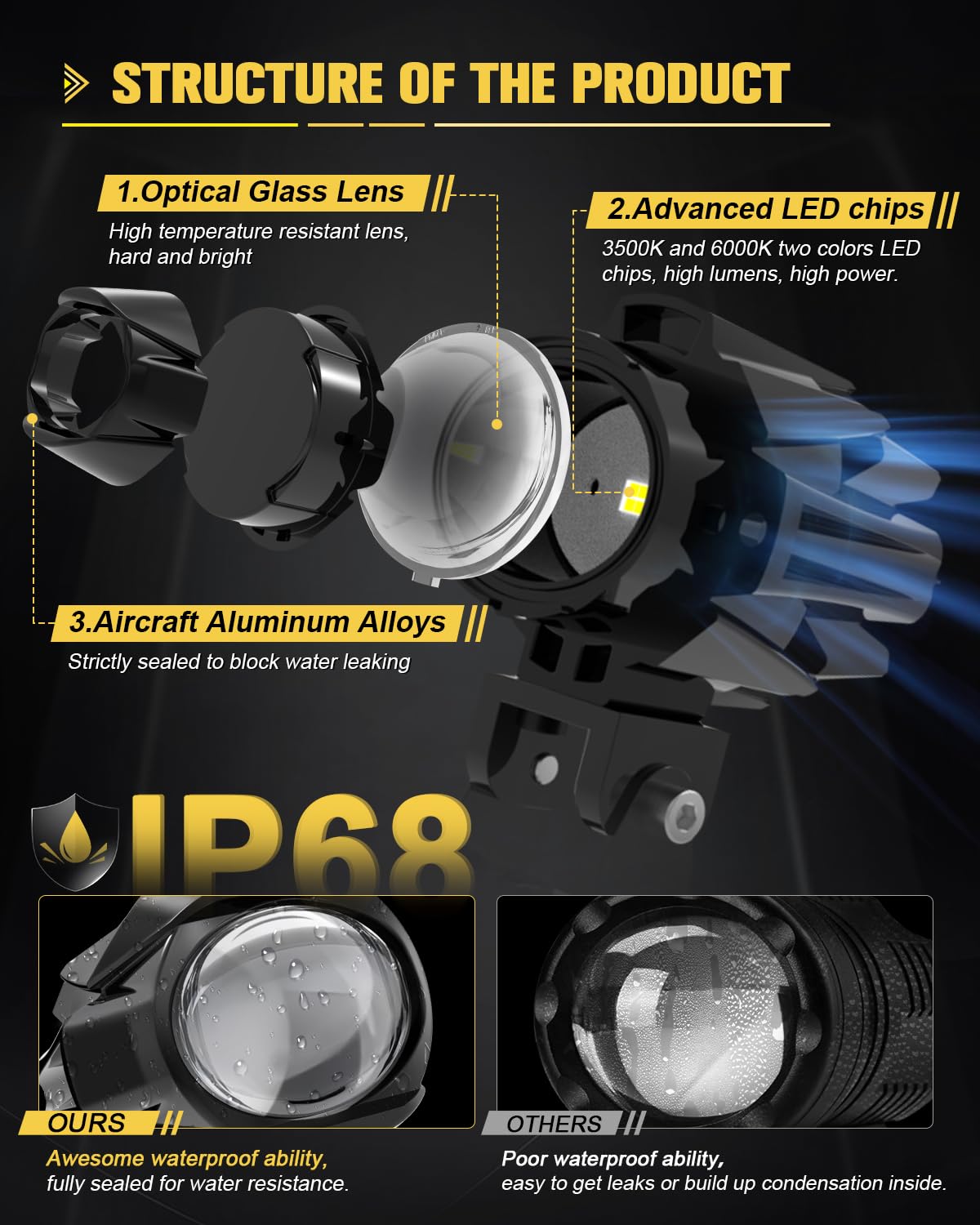 Exceptional Performance: Co Light Motorcycle Led Fog Lights Stand Out From Other Similar Priced Products With Only One Or Two Lighting Modes. Our Lights Offer 3 Constant Lighting And 4 Strobe Lighting Modes: Constant White(High Beam With 6500K 10000Lm), Constant Amber Fog Light(Low Beam With 3000K 8000Lm), Constant White+Amber(Combined Beam), White Strobe Simultaneously And Alternately, Amber Strobe Simultaneously And Alternately. Whether It'S Night, Rainy, Snowy, Or Foggy, These Dual Color Led Lights Help You See The Road Ahead Clearly And Avoid Obstacles Promptly.
