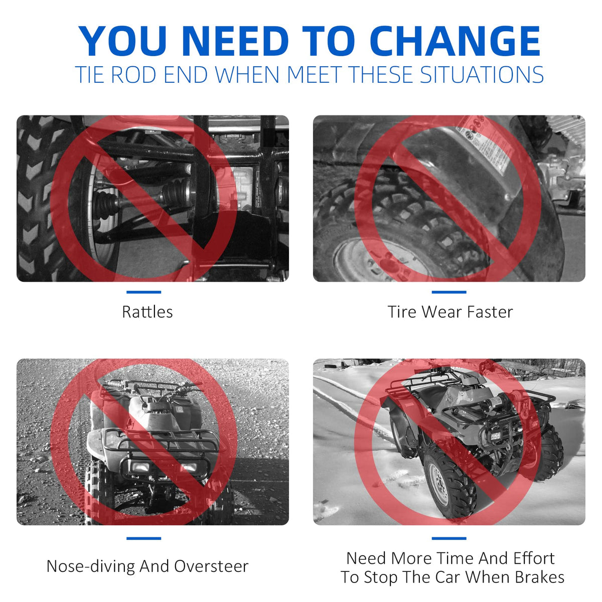 Q: What are the signs that I need to replace my tie rod ends?A: You should consider replacing your tie rod ends if you notice rattling noises, faster tire wear, nose-diving during braking, or if it takes more effort to stop your vehicle. These symptoms indicate potential issues with steering and stability.