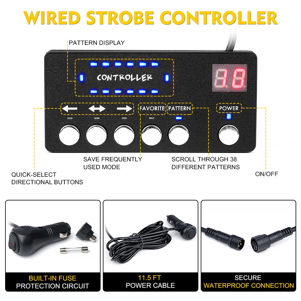 Q: How does the multi-function controller enhance the usability of this strobe light?A: The multi-function controller allows users to synchronize the strobe mode across the LED lights, switch between three directional light modes, and store frequently used patterns in a 'FAVORITE' setting, making it highly convenient for various traffic situations.