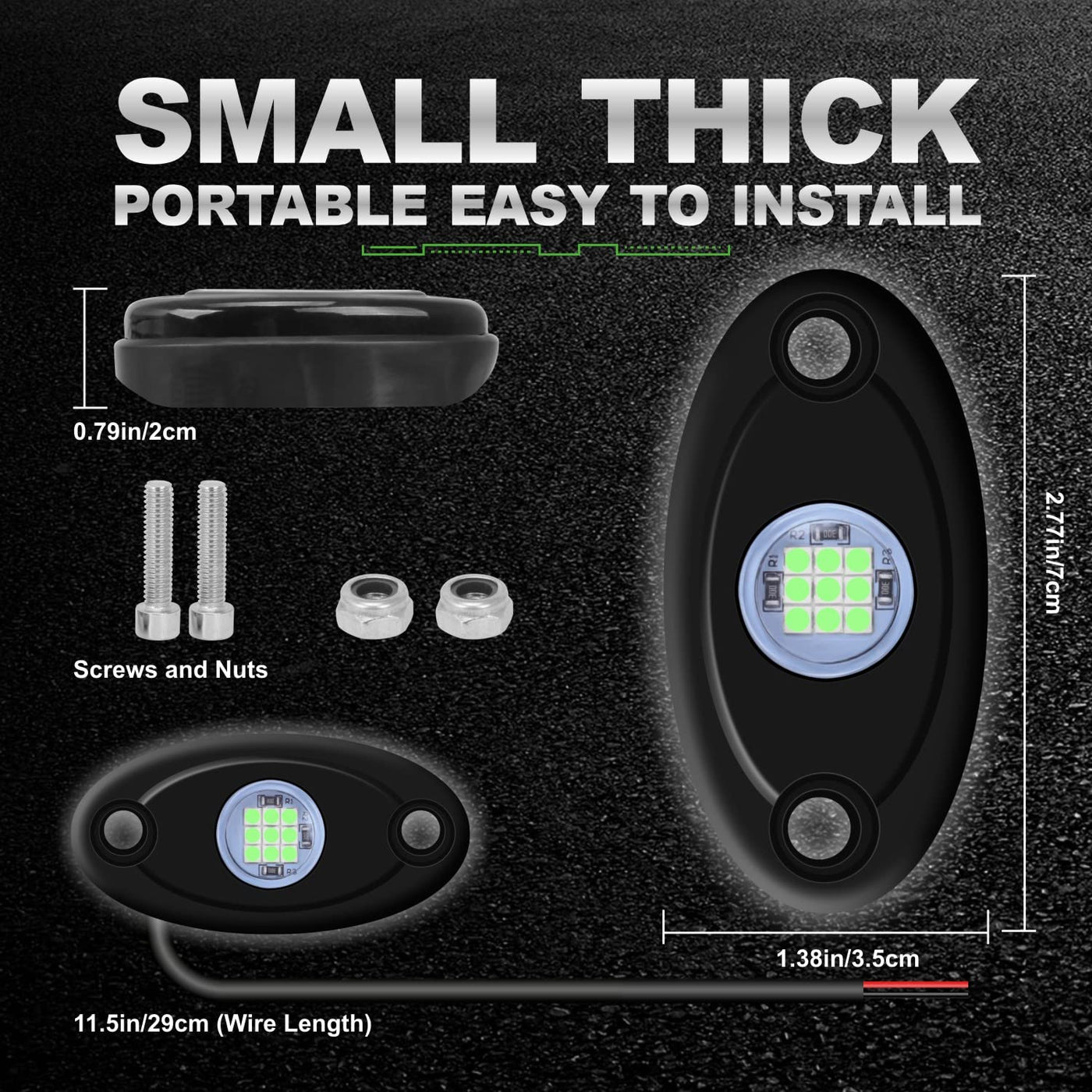 Rock Lights Color: Green Voltage:9-16V Dc Led Chips: 9Pcs Per Light Wire Length: About 11.5Inch Waterproof Rating: Ip68 Material: Led Chips, Die-Cast Aluminum Housing, Pc Lens Box Come With: Green Led Rock Lights 4 Pcs, Screw 4 Set, Rubber Pad 4 Pcs