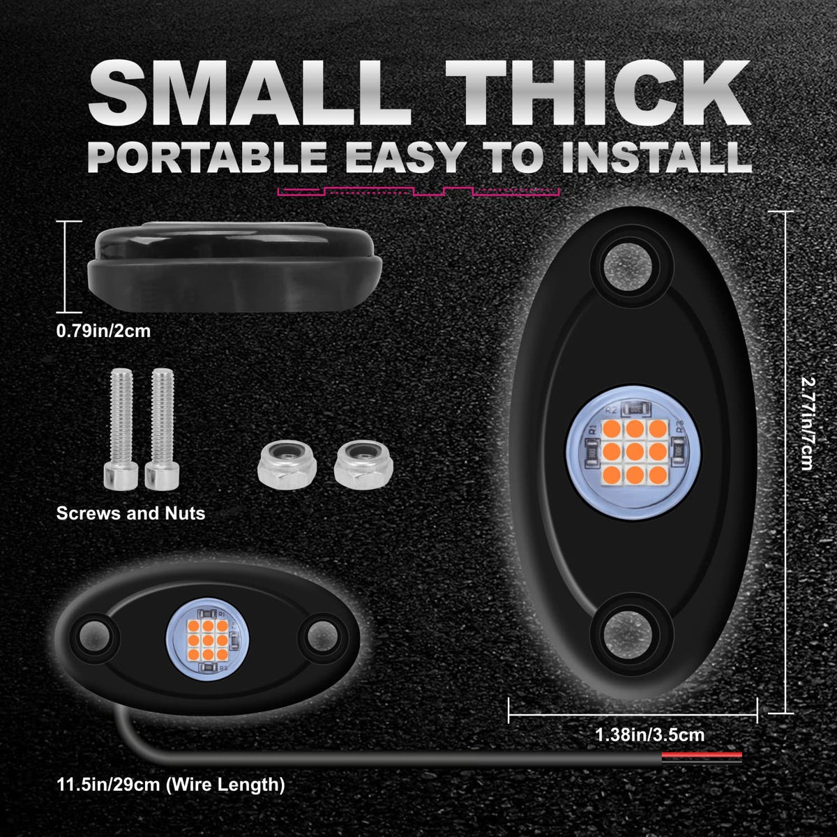 Rock Lights Color: Purple Voltage:9-16V Dc Led Chips: 9Pcs Per Light Wire Length: About 11.5Inch Waterproof Rating: Ip68 Working Hours: 50,000 Hrs Material: Led Chips, Die-Cast Aluminum Housing, Pc Lens Box Come With: Green Led Rock Lights 4 Pcs, Screw 4 Set, Rubber Pad 4 Pcs