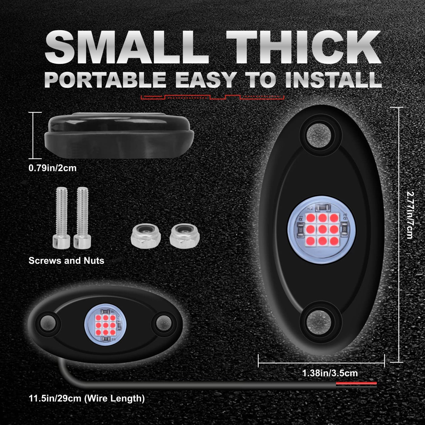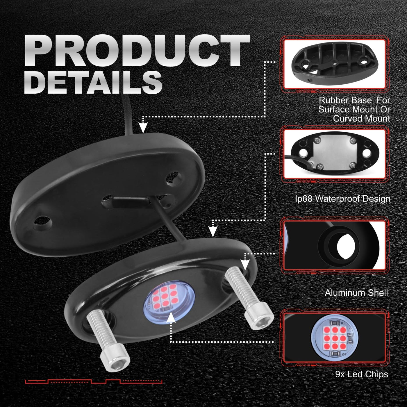 Rock Lights Color: Red Voltage:9-16V Dc Led Chips: 9Pcs Per Lights Wire Length: About 11.5Inch Waterproof Rating: Ip68 Material: Led Chips, Die-Cast Aluminum Housing, Pc Lens Box Come With: Red Led Rock Lights 4 Pcs, Screw 4 Set, Rubber Pad 4 Pcs