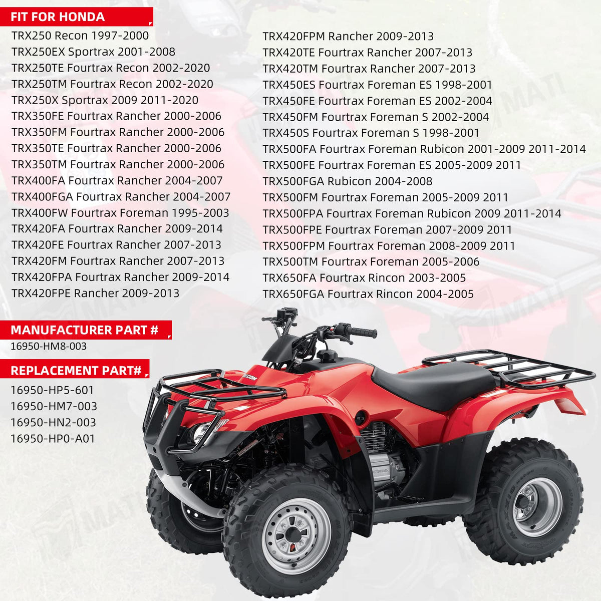 Q: What Honda ATV models are compatible with the M MATI Fuel Cock Petcock?A: The M MATI Fuel Cock Petcock is compatible with various Honda ATV models including TRX250, TRX350, TRX400, TRX420, TRX450, and TRX500, covering years from 1995 to 2020. Specific models include TRX250 Recon, TRX250EX, TRX350FE Rancher, TRX420FA, and TRX500FA among others.