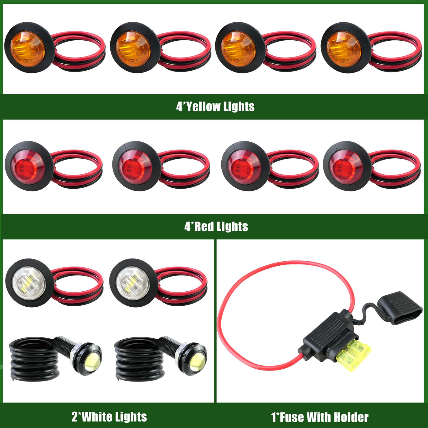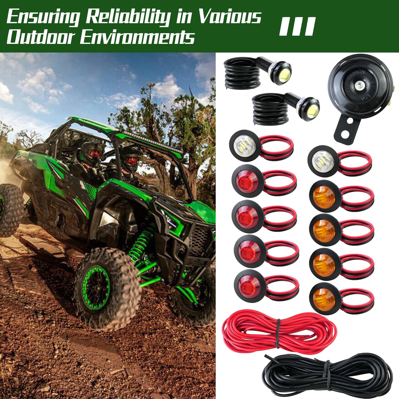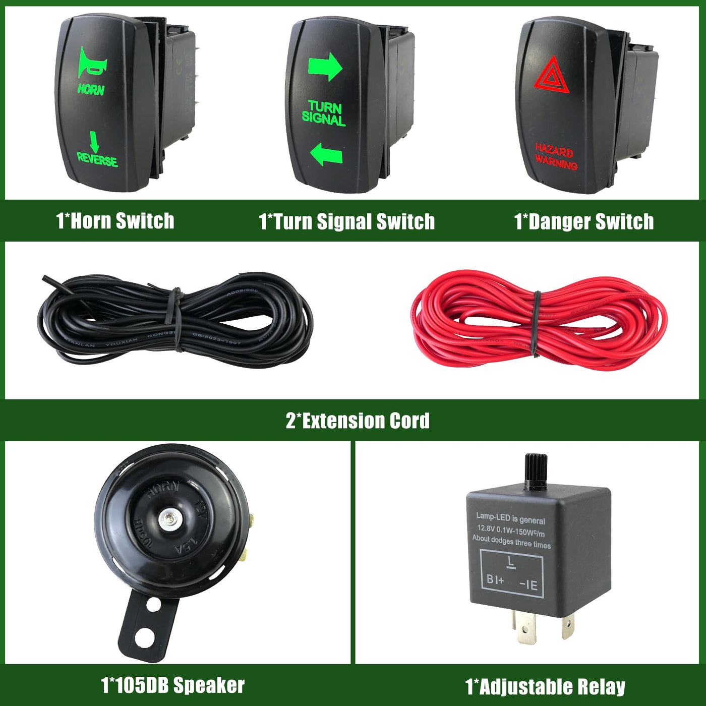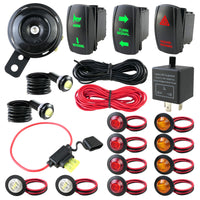 Make Them An Essential Accessory For Your Outdoor Drive With Our Turn Signal Kit For Sxs Atv Utvs. With Its Reliability And Durability, This Turn Signal Light Kit Is Easy To Use Even In Inclement Weather, While Being Widely Compatible With A Wide Range Of Car Models. Product Name: Universal Atv Utv Sxs Turn Signal Kit Products Include: 1*Turn Signal Switch 1*Danger Switch 1*Horn Switch 1*Fuse With Holder 1*Adjustable Relay 1*105Db Speaker 4*Yellow Lights 4*Red Lights 2*White Lights 2*Reverse Lights 1*Red Extension Cord 1*Black Extension Cord Features: 1. The Utv Turn Signal Kit Is Equipped With 2 Pieces Of 158-Inch Extension Cables To Meet Your Various Wiring Needs, Aiming To Provide You With More Flexible Use Possibilities. 2. The Adjustable Flash Relay Allows You To Customize The Flash Frequency And Mode According To Different Scenes And Preferences To Achieve Personalized Flash Effects. 3. The Waterproof Horn In The Rocker Switch Is Very Suitable For Outdoor Use In The Driving Room. It Can Maintain Excellent Sound Quality For A Long Time, And It Will Be Your Ideal Choice.