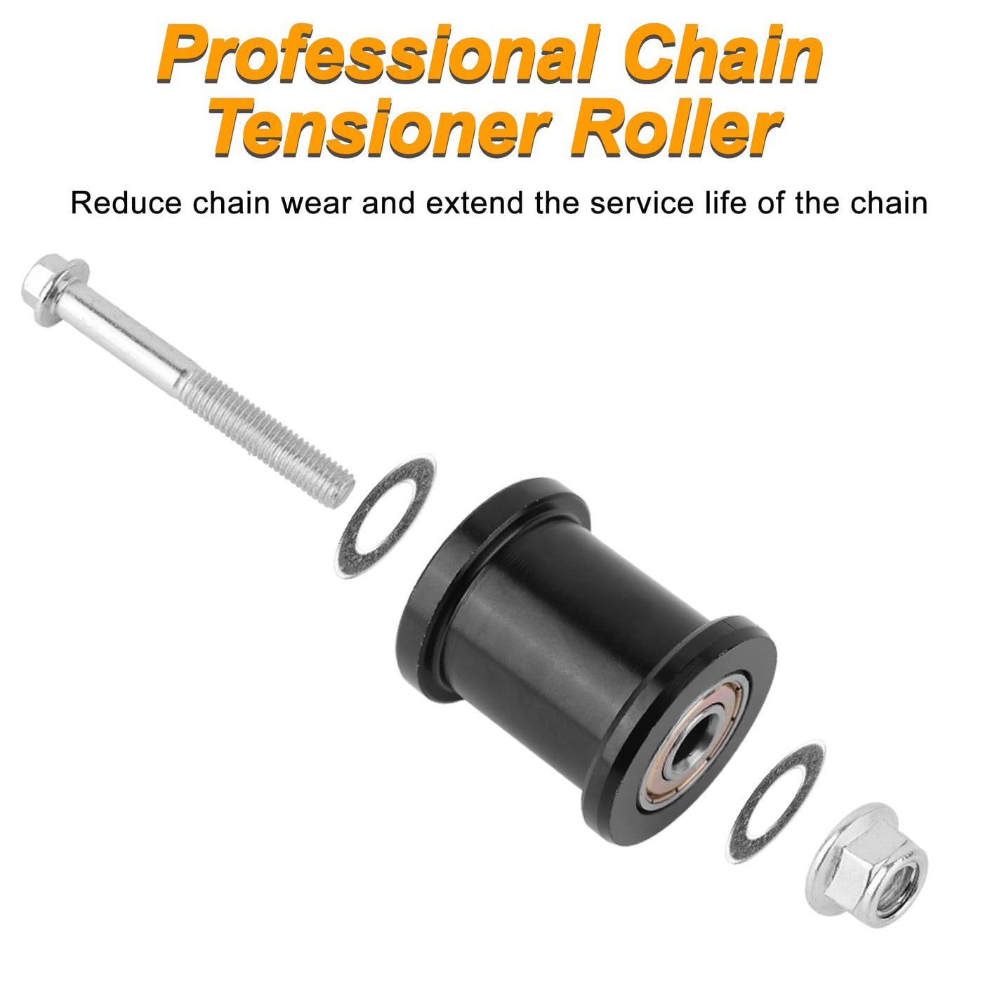 Q: What materials is the chain tensioner roller made of?A: The chain tensioner roller is constructed from heavy-duty metal, providing durability and wear-resistance. Its smooth surface helps reduce chain wear and maintains optimal chain function.