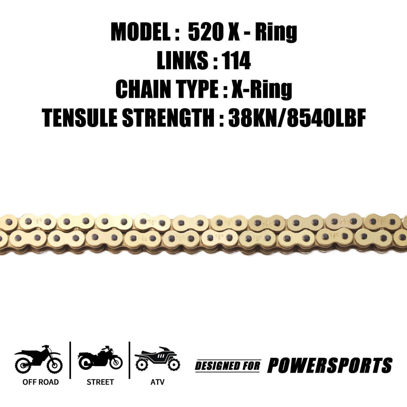 ?Replacement Part Number?: Compatible With Hond*: 40530-Krn-A31, 40530-Kz3-B01, 40530-Kz3-B02, 40530-Mke-A92; Kawasaki: 92057-0184, 92057-0192, 92057-0678, 92057-0695, 92057-0710, 92057-0740; Kawasaki: 92057-1438; Suzuki: ?High Quality & Durable ?:Expertly Crafted With Quad-Riveted Pins, Hardened Steel Components And Premium Nbr X-Rings, X-Ring Drive Chain Reduces Chain Friction, Extends Seal Life, Improves Seal Performance In Comparison To O-Ring Alternatives. Made For Riders Who Need Extreme Performance. ?Product Parameters?: Ultra-High-Performance X-Ring Drive Chain , 520 Pitch,114 Links.Master Connecting Link Type - Clip For Easy Install , Tensile Strength 38 Kn Or 8540 Lbf. ?Chain Breaker Powerful?: Links Can Be Removed To Fit Virtually Any Application, Like 50Cc 70Cc 90Cc 110Cc 125Cc Atvs And Dirt Bikes, Go Kart, Mini Bike, Scooter, Pit Bike, Quad, Etc. ?Package Includes?:1*520 X-Ring Chain 114 Links ,2*Connecting Master Link,1*Chain Breaker