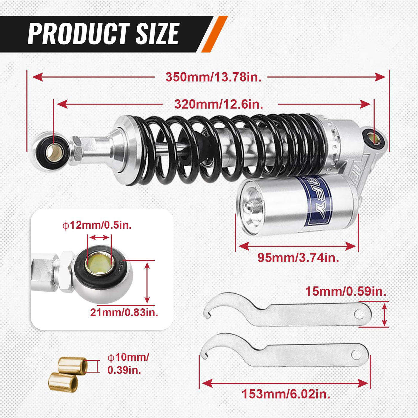 Newsmarts 2pcs 12.5 320mm Air Shock Absorbers Rear Nitrogen Suspension Universal Fit for HONDA for Yamaha ATV Go Kart Quad Dirt Sport Bikes,Blue Condition: Brand new Color: Silver and Black Material: Solid Steel + Aluminium Alloy+ Rubber Installation Type: Eye to Eye Fitment: Universal Fit. Work on most 150cc street bikes, Scooters and Moped Quad (ATV) with shocks of 320mm eye to eye distance. Great choice for replacement, style upgrading and all kinds of bike modification. Dimension: Total Length: 350mm (13 3/4'') Length of Eye to Eye Core: 320mm (12 5/8'') Eye Diameter(with bushing): 12mm Eye Diameter(with bushing removed): 16mm Eye Thickness: 21mm Eye Maximum Tensile Strength: 2,000 Kgf Spring Thickness: 7mm Spring Width: 60mm Working Stroke: 60mm Spring Stiffness: 110 kg Maximum load: 200 kg (440 lbs) Air Reservoir: Adjustable Factory Air Pressure: 0.4 Mpa Maximum Air Pressure: 0.5 Mpa Fitting manual is not included. Instalby qualified mechanic is recommended. Packaged Included: 1 Pair Shock Absorbers