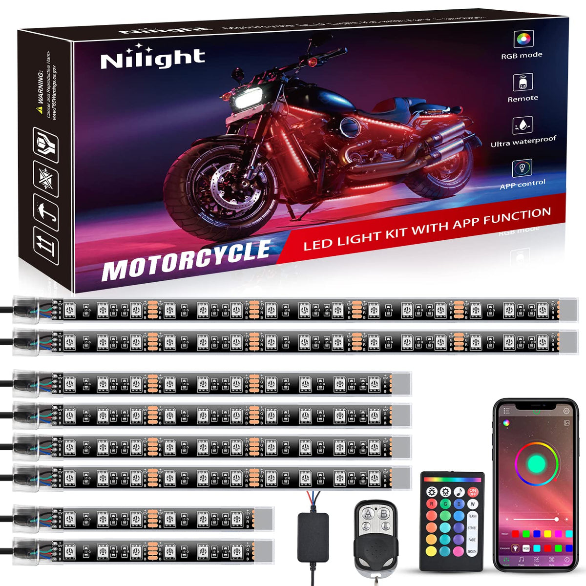 Dual Remotes&APP Control: Nilight motorcycle underglow lights includes an IR and RF Remote that is easy to carry and control. On this basis, we added the intelligent APP mobile control, maximize your DIY possibilities and access 16 million RGB colors | Highlight your motorcycle: Our motorcycle led lights delivers 16 million static colors, has 8 dynamic strobe modes, 2 preset Jump and 12 fading patterns, 4 explosion flash modes, also 1 white light mode always on for daily lighting. Unique sound active modes enhance your driving satisfaction. | Brake Light Function & Music Mode:When you hit the brake, the whole motorcycle led kit turns red to send out a security warning signal. Effectively improve your driver safety. Turn on the music, the LED Chips will dance and flash with the music. Various modes can be switched at will, give you an amazing visual and auditory experience | Easy to Install:With IP68 waterproof & strong adhesive, completely sealed by transparent shell, protect the LED strips to work well. In addition, strong back adhesive can be fixed on any surface such as motorcycle engine compartment, which will bring cool lighting effect for under car lighting. Even driving through lots of rain, highway speeds, potholes, the LED strips can still stay on and work properly. | Package Includes:1 x 8PCS LED light strips, 1 x 24Key RF remote ; 1 x 4Key RF remote ; 1 x replacement fuse ; 1 x control box, 1 X Instruction manual