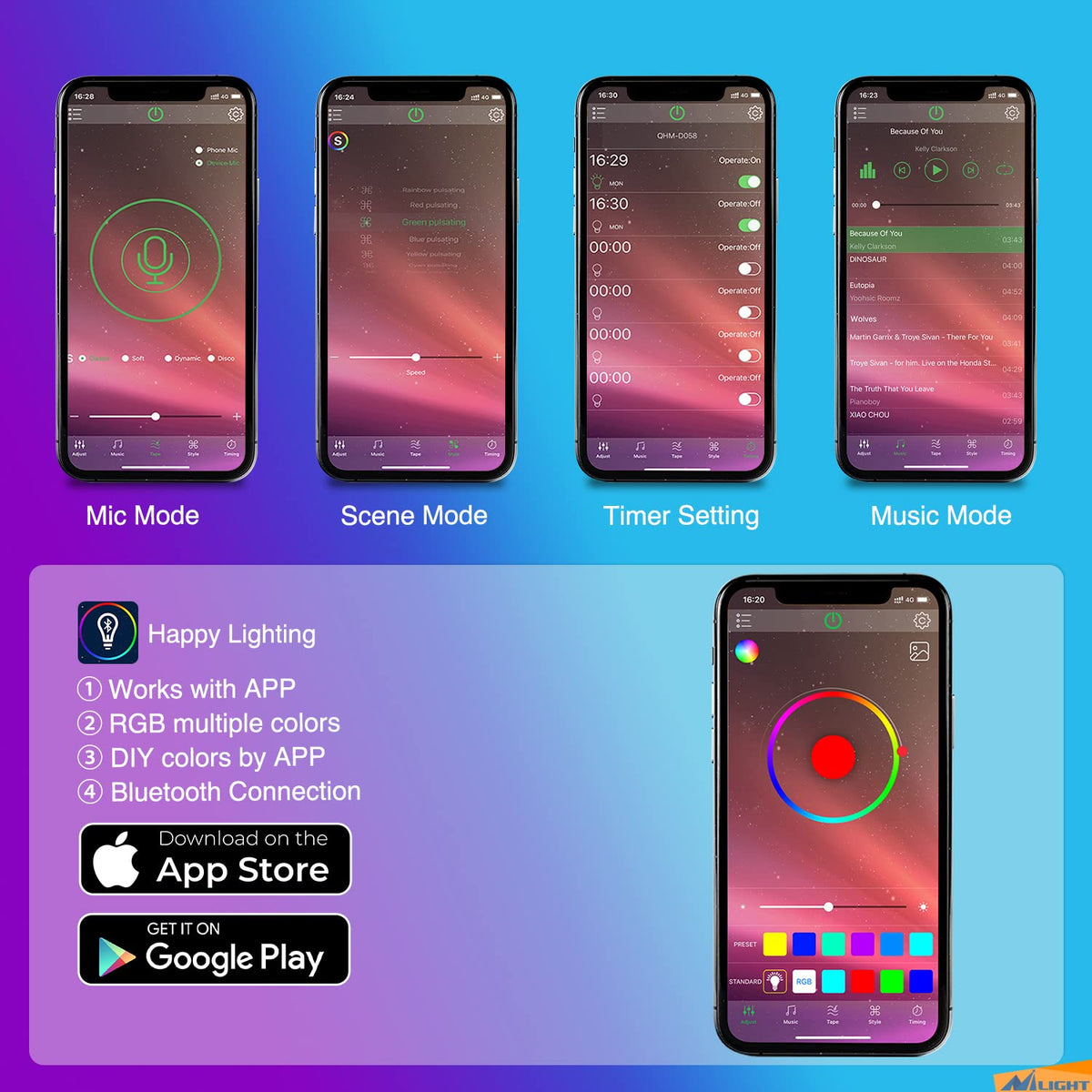 Product Features: Material:High Quality Pvc Rubber Light Color: Rgb Voltage:Dc 12V Led Type: 5050 Smd Sound Active Function Phone App Control: Ios And Android App Connection Steps: 1. Scan The Qr Code On The Manual Or Search For Happy Lighting In The App Store. 2. Turn On Your Phone Bluetooth. 3. Open App And Connect The Light. (Connect Bluetooth In App Instead Of Mobile Phone Settings) Note: Before Installing, Please Clear The Surface Of Place Where The Lights Will Install Using Cloth.