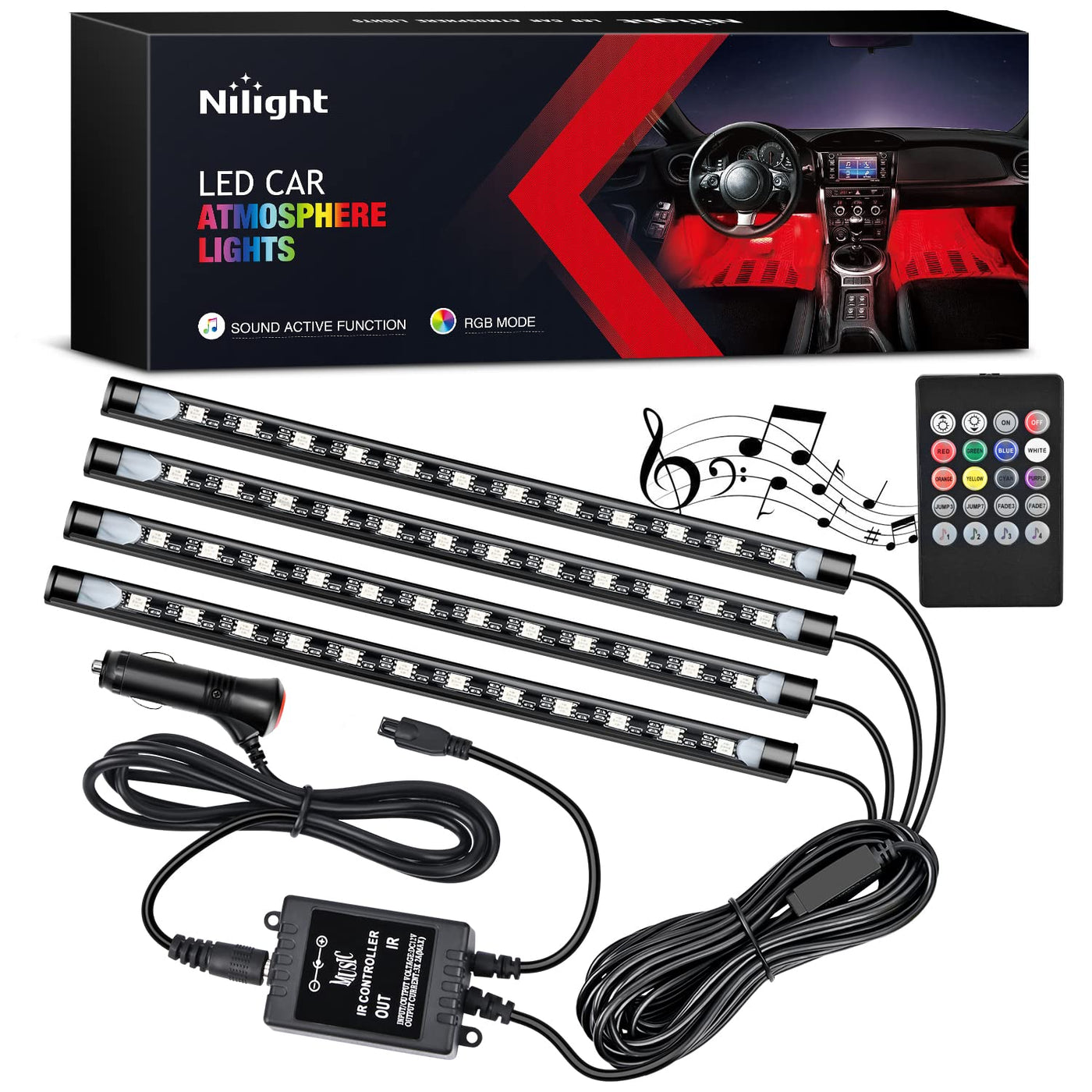 Nilight - Tr-06 4Pcs 48 Led Interior Lights Dc 12V Multicolor Music Car Strip Light Under Dash Lighting Kit With Sound Active Fu