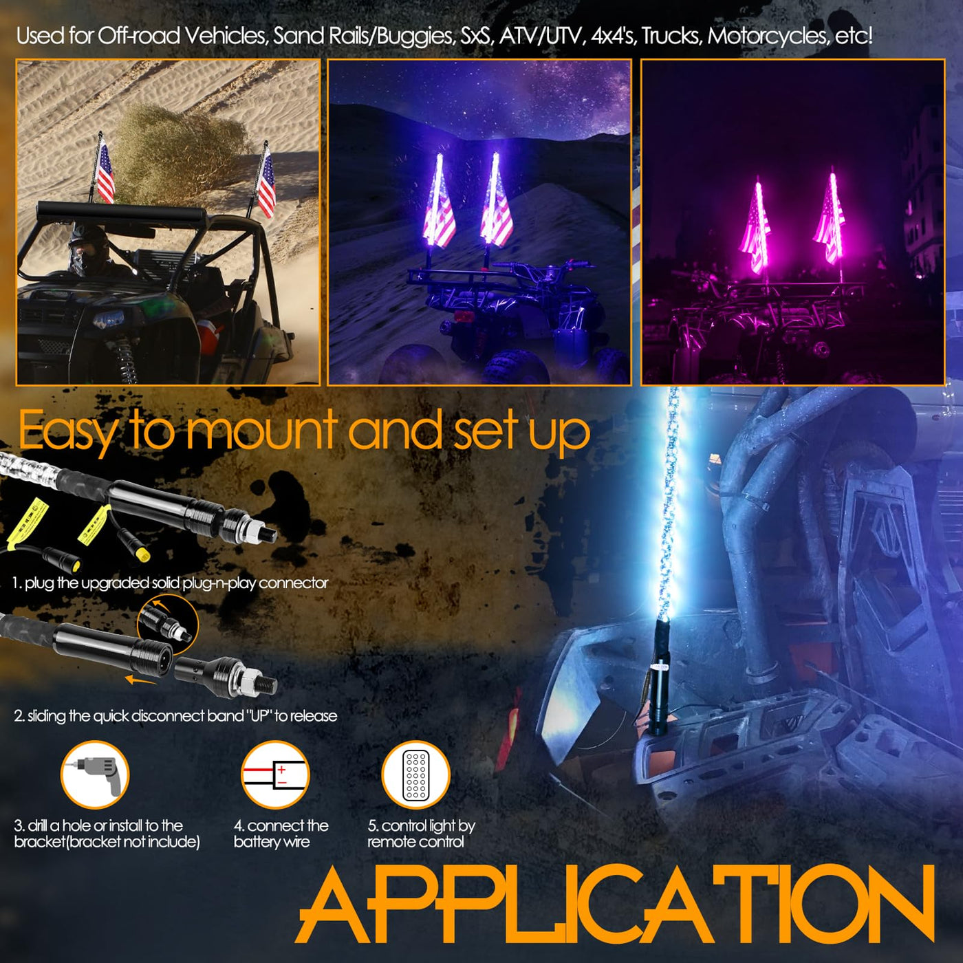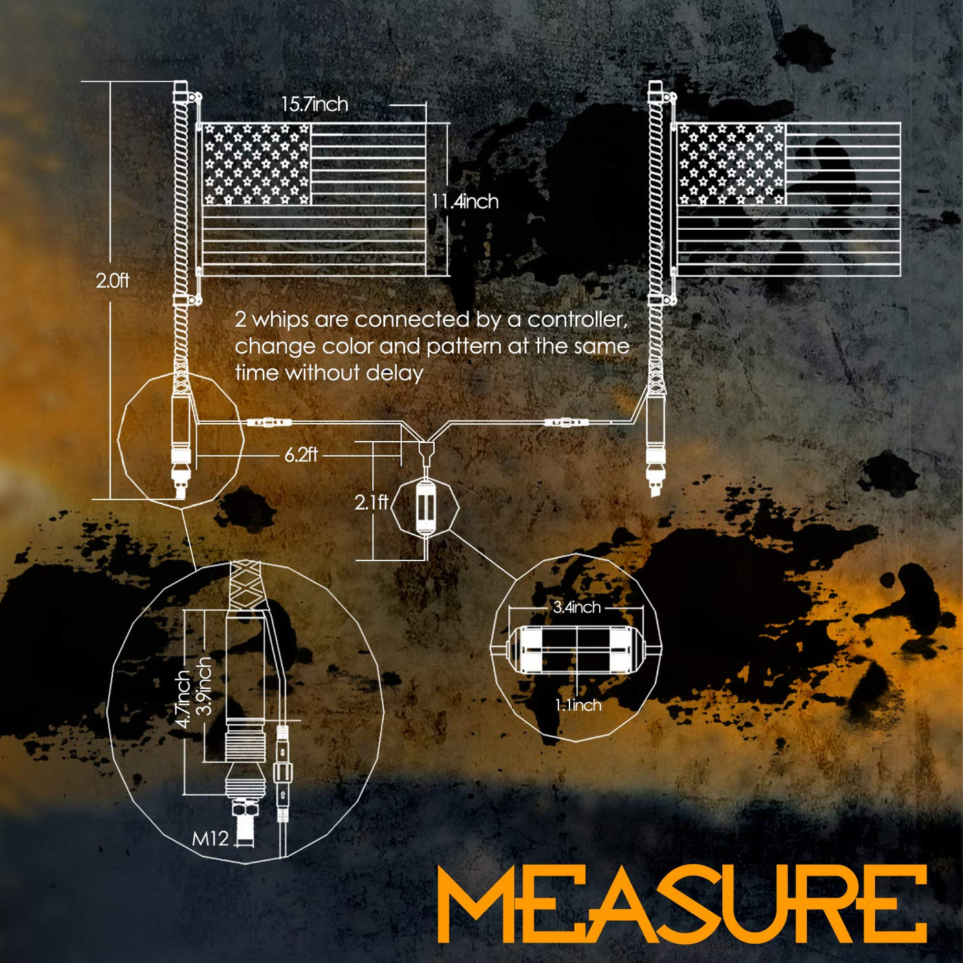 Nirider LED lights are designed and built to be tough, built to last and built with the absolute commitment to quality. Our mission is to design premium unique products that illuminate lifes adventures.FEATURESBlack version with 360 visibility180 bendable, waterproof, dustproof and shockproof300 patterns, 63 modes, 32 brightness and 10 speed settingsWith memory functionClean and easy to installUniversal, fit for all type of vehiclesAll in oneSPECSSize: 2ftLED: 204pcs RGB/pairColor: 20 color options(RGB, blue, red, green, white, yellow, orange, pink, purple, and custom configurations)Pattern: 300 kinds of pattern(chasing, build-up, strobe, flash, blink, and more)Mode: 63 kinds of mode, Brightness: 32 levels, Speed: 10 levelsLifespan: 50,000+ hoursWaterproof: Ip67Operating voltage: 12-24V DCOperating temp: -40? to 58?Material: Housing: EVA + silicon, Base: aluminum with quick release, Harness: PVC, Flag: nylonOverload protection: yesRadio frequency/RF: 433HzService distance of remote control: 10MCertified by CE & ROHSAPPLICATIONSThe universal LED whips can be installed in any location no matter what make and model you drive, youre sure to find the perfect position for it. These are made with the best quality components because we understand the frustration that a broken LED lighted whip can keep you from enjoying your time off-road.BOX COME WITH2PCS 2ft LED whips w/7.3 ft plug-n-play harness and control box, remote control, quick connect / disconnect base, American flags w/quick release hooks and adjustable grommets, hardware, black whip cap for dustproof, manual.CONTACT USNirider is all about quality and customer service. If need any help please contact our emails.Go to your order and find the order on the list, click contact seller button to contact.