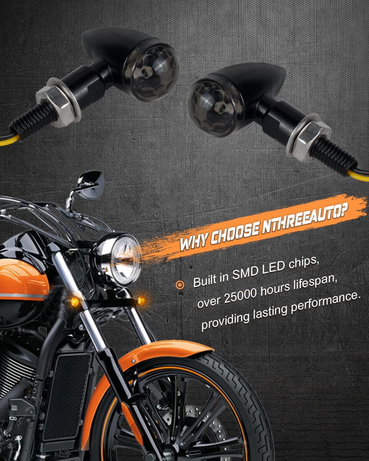 Features: Lens Color: smoked Light Color: amber Voltage: 12V Mounting Bolt: 8mm Length of Mounting Thread: 20mm Wire Length: approx. 32cm/12.59inch Material: metal housing + PC Lens + led chips Features: Mini size but super bright Bullet Design: match with your motorcycles perfactly IP67 Waterproof: no moisture inside after heavy rain Chrome Finished Body: strong and durable Fitment: Fit for most motorcycles with 8mm bolt turn signals. Compatible with harley honda yamaha kawasaki cruisers, sportbikes, choppers, enduros, touring sport, touring, vintage & customs, standard motorcycles Notification 1. If the lights keep solid, don't blink, you need to replace your factory flasher relays with led relay 2. If the lights get hyper flash, recommend installing a resistor to solve the issues