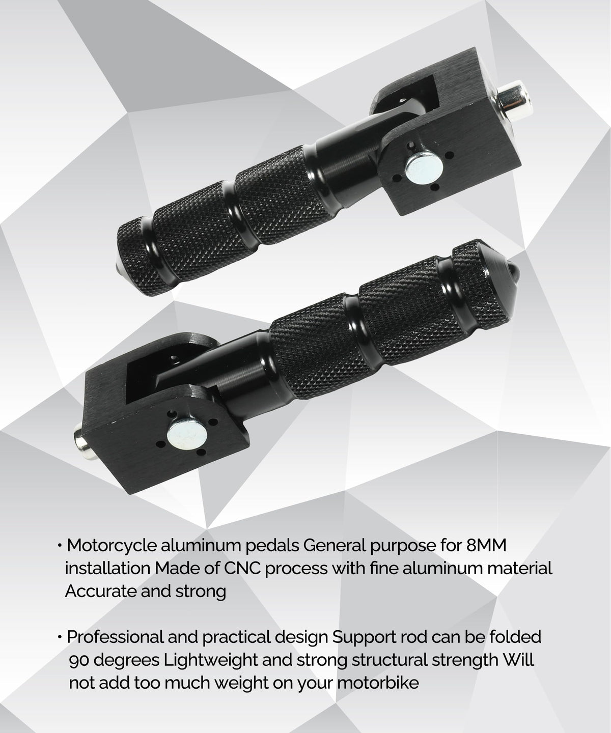 Material:< /B> Aluminum Alloy< Br > Dimensions: < /B>5.1 Inches And 5.7 Inches< Br > < Br > What Will You Get In The Box?< /B>< Br > -1 Pair Of Motorcycle Pedals< Br > < Br > Our Product Advantages:< /B>< Br > -Made Of Cnc Processed Aluminum Alloy, Anodized To Prevent Oxidation And Scratches< Br > -Lightweight, High Structural Strength, No Increase In Motorcycle Weight, Durable And Durable< Br > -The Knurled Anti Slip Design Provides Passengers With Great Safety And Comfort< Br > -Add A Touch Of Elegance To Your Motorcycle And Enhance Its Body Grade< Br > -The Front Pedal Rebounds, The Rear Pedal Is 90 Degrees, And The Support Rod Can Be Folded And Fixed By 90 Degrees< Br >