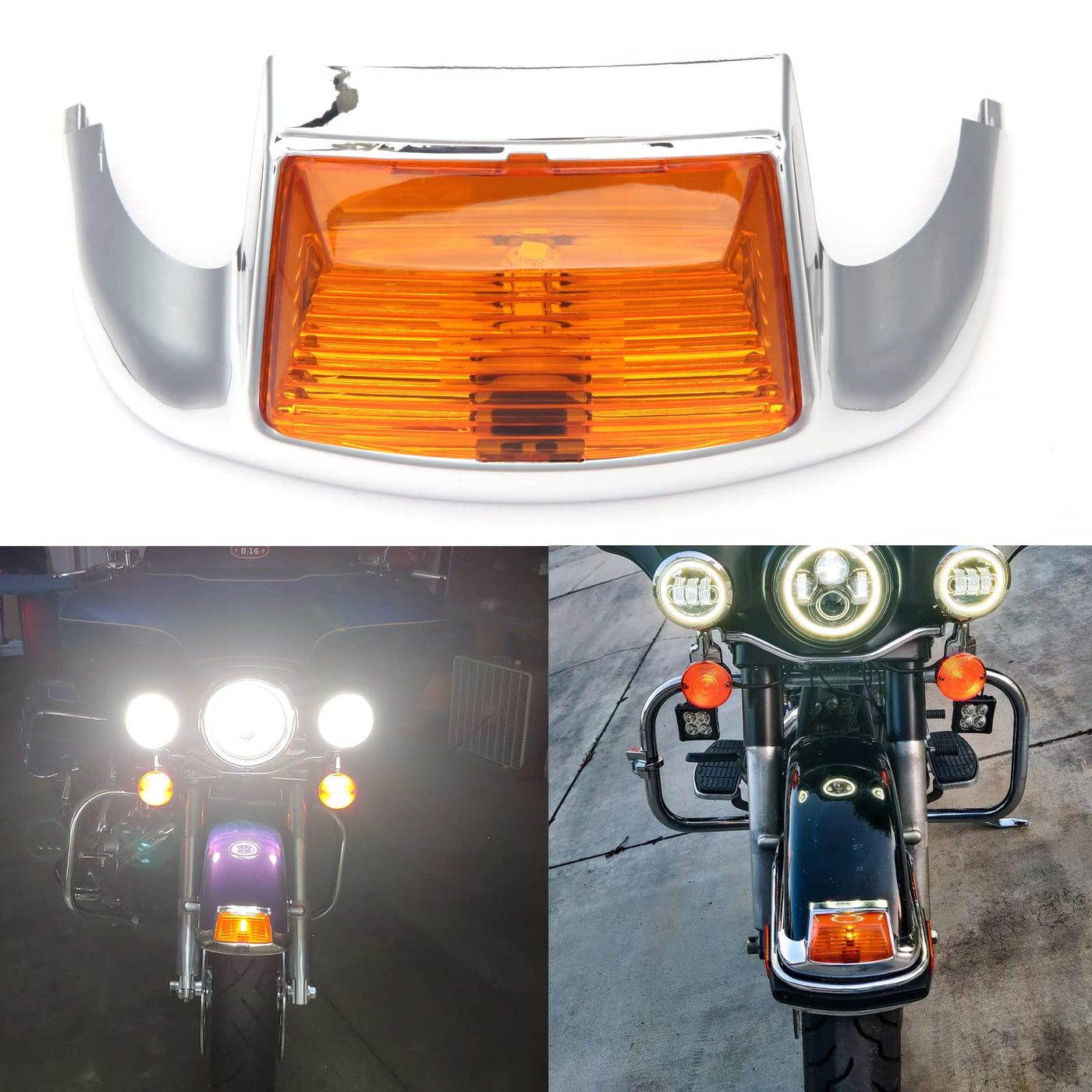 Compatible with 2000-2013 Harley FLHR Road King,2007-2013 FLHRC Road King Classic,2000-2006 FLHRI Road King,2000-2009 FLHT Electra Glide Standard,2000-2005 FLHTC Electra Glide Classic,2007-2013 FLHTC Electra Glide Classic,2000-2006 FLHTCI Electra Glide Classic,2007-2013 FLHTCU Electra Glide Ultra Classic | Compatible with 2000-2006 FLHTCUI Electra Glide Ultra Classic,2006 FLHTCUSE,2007 FLHTCUSE2,2008 FLHTCUSE3 Screamin Eagle Ultra Classic Electra Glide,2003-2006 FLHTI Electra Glide Standard,2001-2017 FLSTC Heritage Softail Classic,2001-2006 FLSTCI Heritage Softail Classic,2006 FLSTI Heritage Softail | LED Front Fender Lights Kits - Upgrade illumination element, built-in high visible LED chips, uniform illumination, wide-angle illumination, improve the poor illumination range caused by factory bulb, brighter than halogen bulbs. Low power consumption, low heat generation; Perfect replace the traditional tungsten filament light. | Features - Add new features to the motorcycle in appearance and maintain clear visibility without weakening the LED lighting, more modern, stylish. Integrated fender tip trim design, perfectly contours to fender tips. Black - negative, red - positive. NOTE: You will need to use the existing plug from your tail light and splice it onto the bare wires that come with the new light, may need to use your stock wires or add additional wires. | Upgrade Illumination Element - Built-in high visible LED chips, uniform illumination, wide-angle illumination, improve the poor illumination range caused by factory bulb.