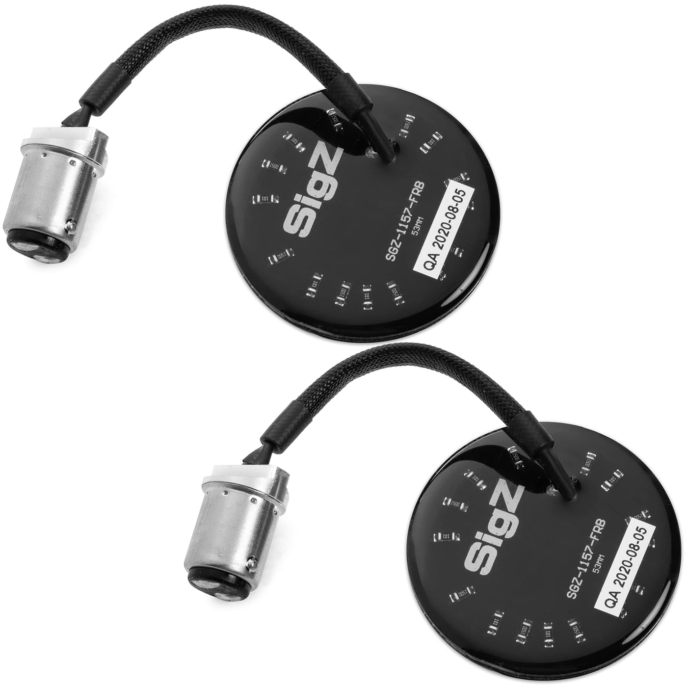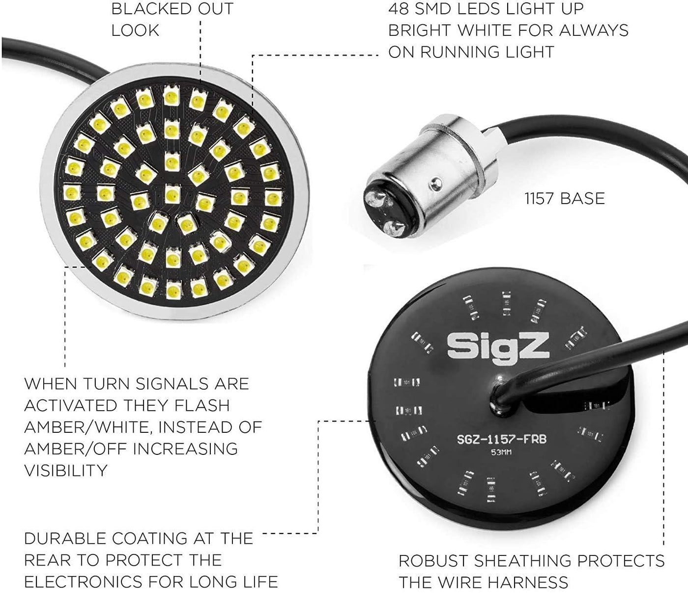 GET LIT Rogue Rider Industries SigZ front turn signals motorcycle lights compatible with Harley Davidson motorcycles. Our Black Label Special Edition and will make your ride stand out! Our turn signals LED lights have a black background and are compatible with Harley models that have 1157 bullet-style housings that function both as turning signals and running lights. This LED motorcycle lights kit was not designed for bikes with front turn signal function only. WHITE AND AMBER LED TURN SIGNALS The round lights feature 2 colors: white and amber. The motorcycle turn signal lights change color based on whether they are acting as signaling or running lights. Each of the 48 bulbs is an SMD LED light, meaning they mount on the surface of an electronic board, but they dont physically go through the board. This design makes the lights smaller than traditional LED bulbs but still effective. Youll be able to see both in front and to the side like never before, due to a wider viewing angle than traditional LEDs. For use with clear or smoked lenses. EASIEST UPGRADE YOU MAKE TO YOUR BIKE! Our turn signal kit is easy to install thanks to the plug-and-play design of our machined aluminum tabs. You wont need a load equalizer if you are installing these lights on 11-later Softails, 12-later Dynas, 14-later Sportsters, and 14-later Touring and Tri-Glide models. However, earlier models may require a load equalizer to prevent fast flash and error codes. Weve created the ultimate LED motorcycle turn signals with weatherproof wire sheathing and coating on the rear of the circuit board. Order these LED lights for motorcycles and stay safe while biking.