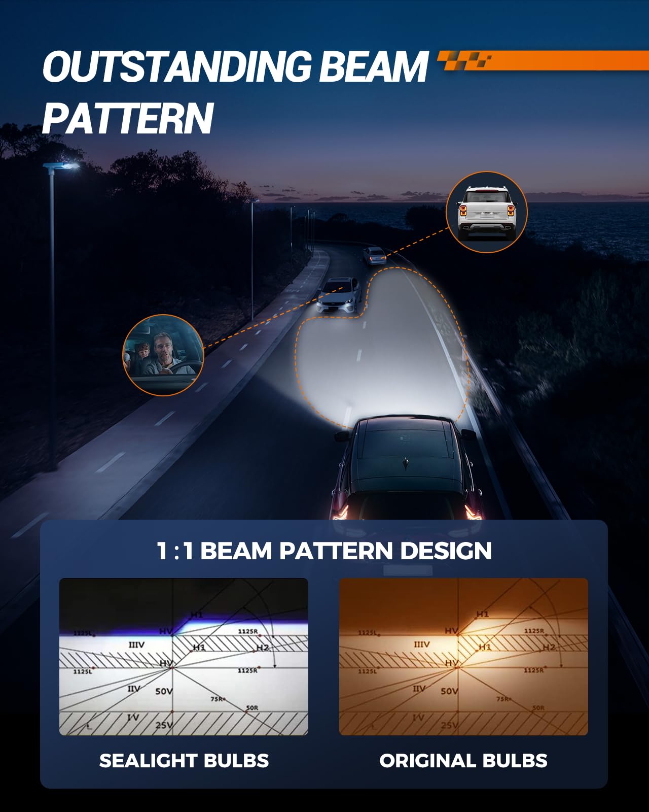 Wider Visual Range: SEALIGHT fog light is brighter than stock bulbs, providing further visibility for you in advance to ensure safer driving at night. | Safe and Reliable: Focus design ensures higher on the passenger side to illuminate road signs and lower on the other side to prevent blinding others. The further visibility increases response time, reducing risk of accidents | 3 Mins Plug and Play: You don't need tools and break anything. It is easy to finish the installation in short time. | More than 60,000 hours: SEALIGHT ATV bulbs Premium aluminum body, carved heat sink, and 12,000 RPM silent turbofan. An efficient cooling system facilitates the dissipation of heat, prolonging the life of the bulbs to over 60,000 hours. | 99% Vehicles Adaptability: The built-in intelligent CSP chips is anti-flicker, compatible with 99% of the system without annoying error. No radio interference