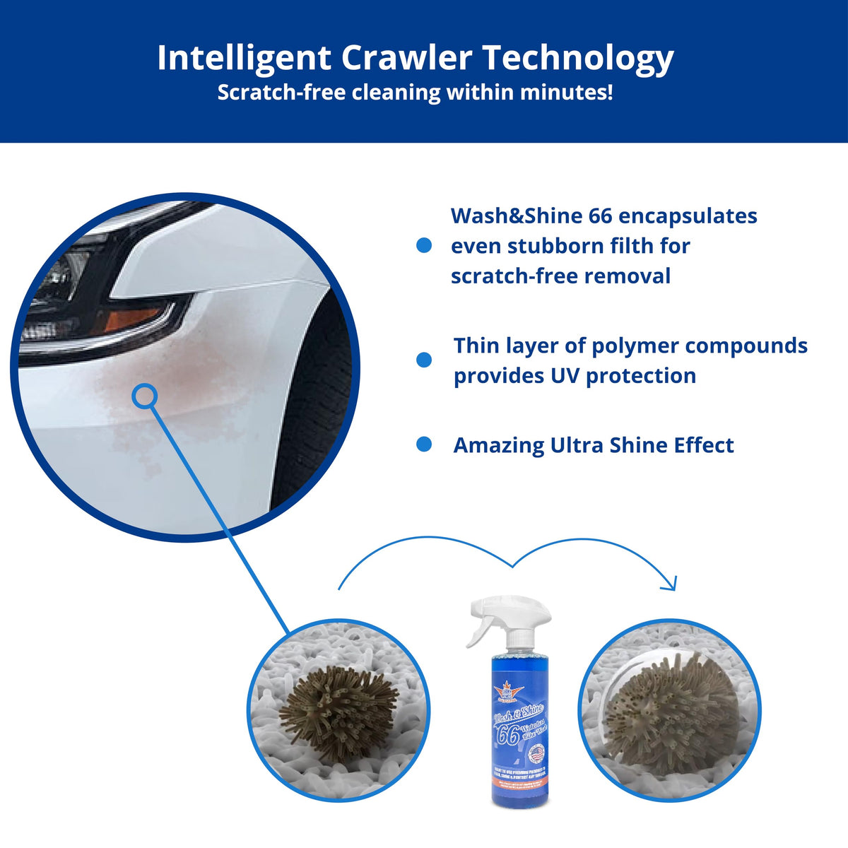 Q: What makes the Intelligent Crawler Technology unique?A: The Intelligent Crawler Technology used in Wash&Shine 66 ensures a scratch and streak-free cleaning experience. It effectively removes dirt and grime without leaving swirls or holograms, providing professional-grade results.