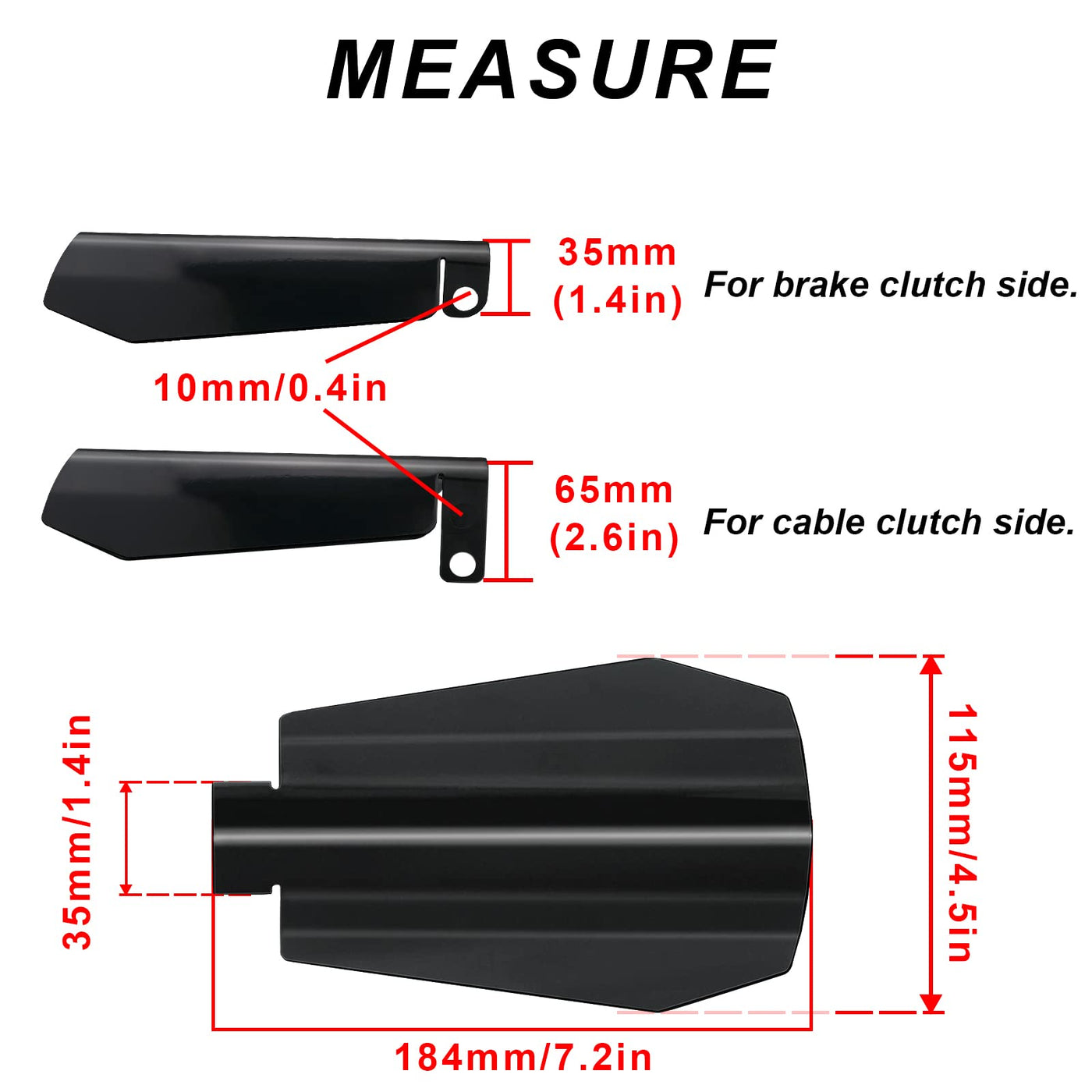 Q: What size are the StarknightMT Handguards and what style do they fit?A: The StarknightMT Handguards are sized at 4.5 inches and are intended for use with the cable clutch style, with the longer guard meant for the cable clutch side and the shorter one for the brake side.