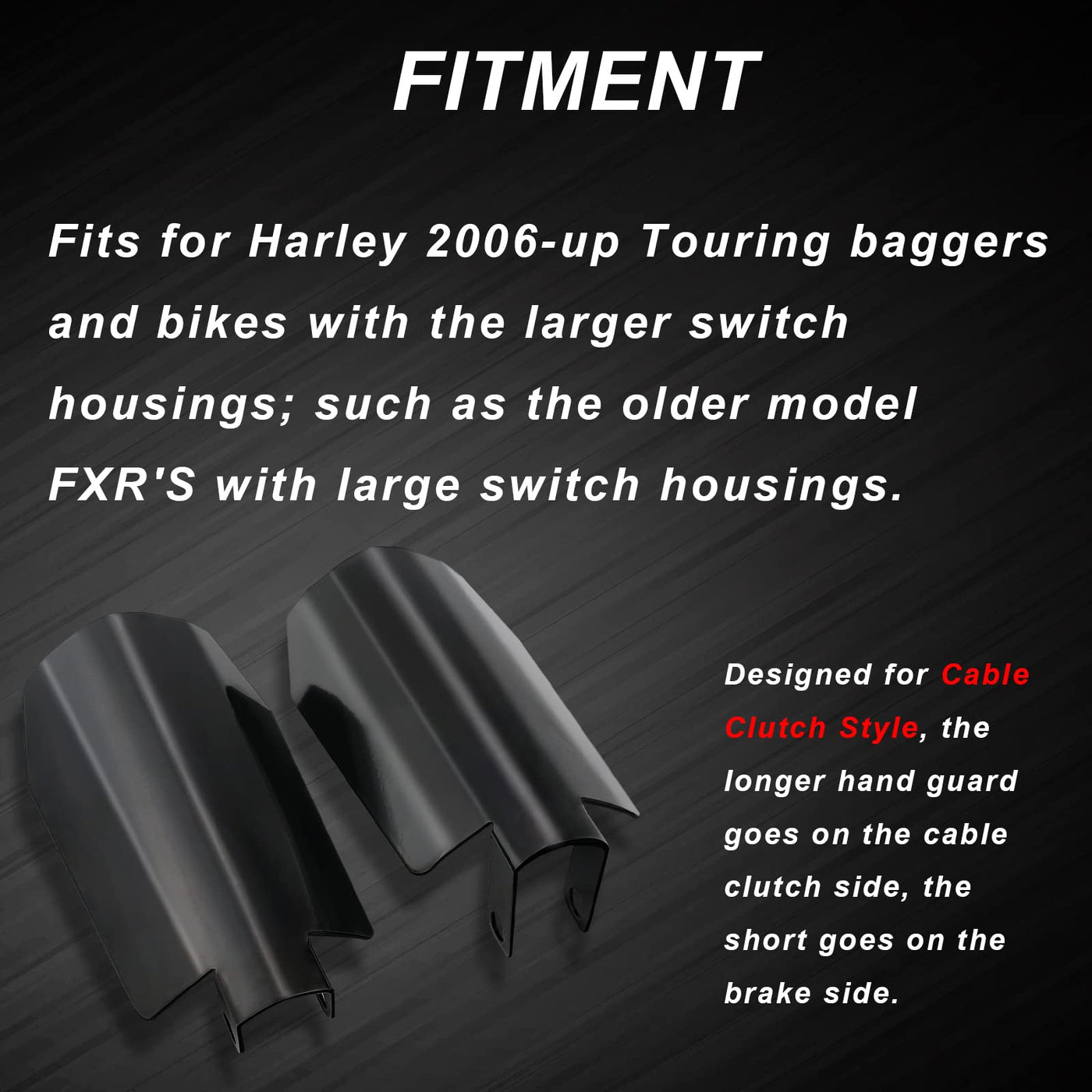 Q: Are the StarknightMT Motorcycle Handguards compatible with all Harley-Davidson models?A: The StarknightMT Motorcycle Handguards are specifically designed for 2006 and later Touring Baggers, including models like Street Glide, Electra Glide, Road Glide, Road King, and FXR's with larger switch housings and cable clutches.