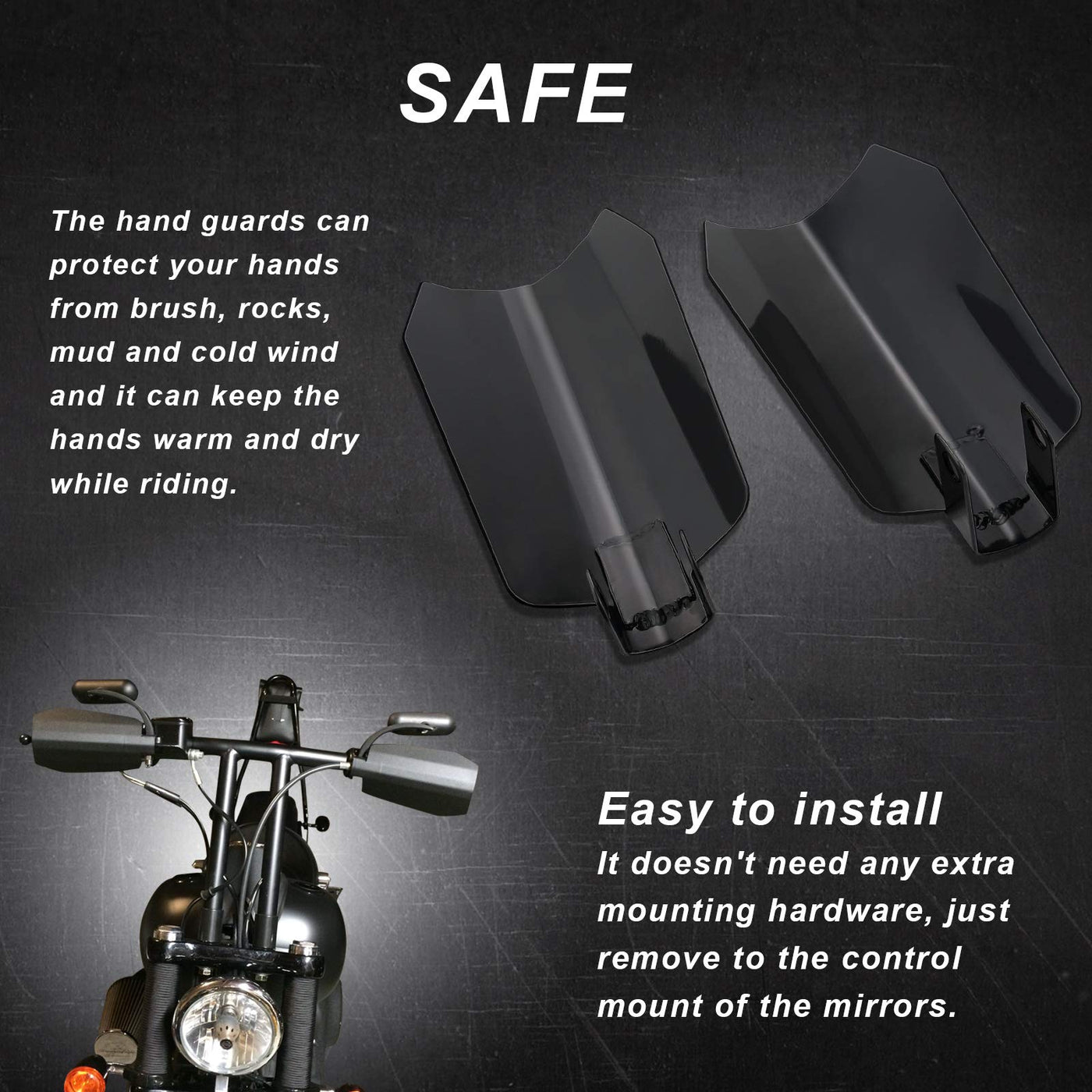 Q: What benefits do the handguards provide while riding?A: The handguards are designed to protect your hands from elements such as brush, rocks, mud, and cold wind, ensuring your hands stay warm and dry during rides.