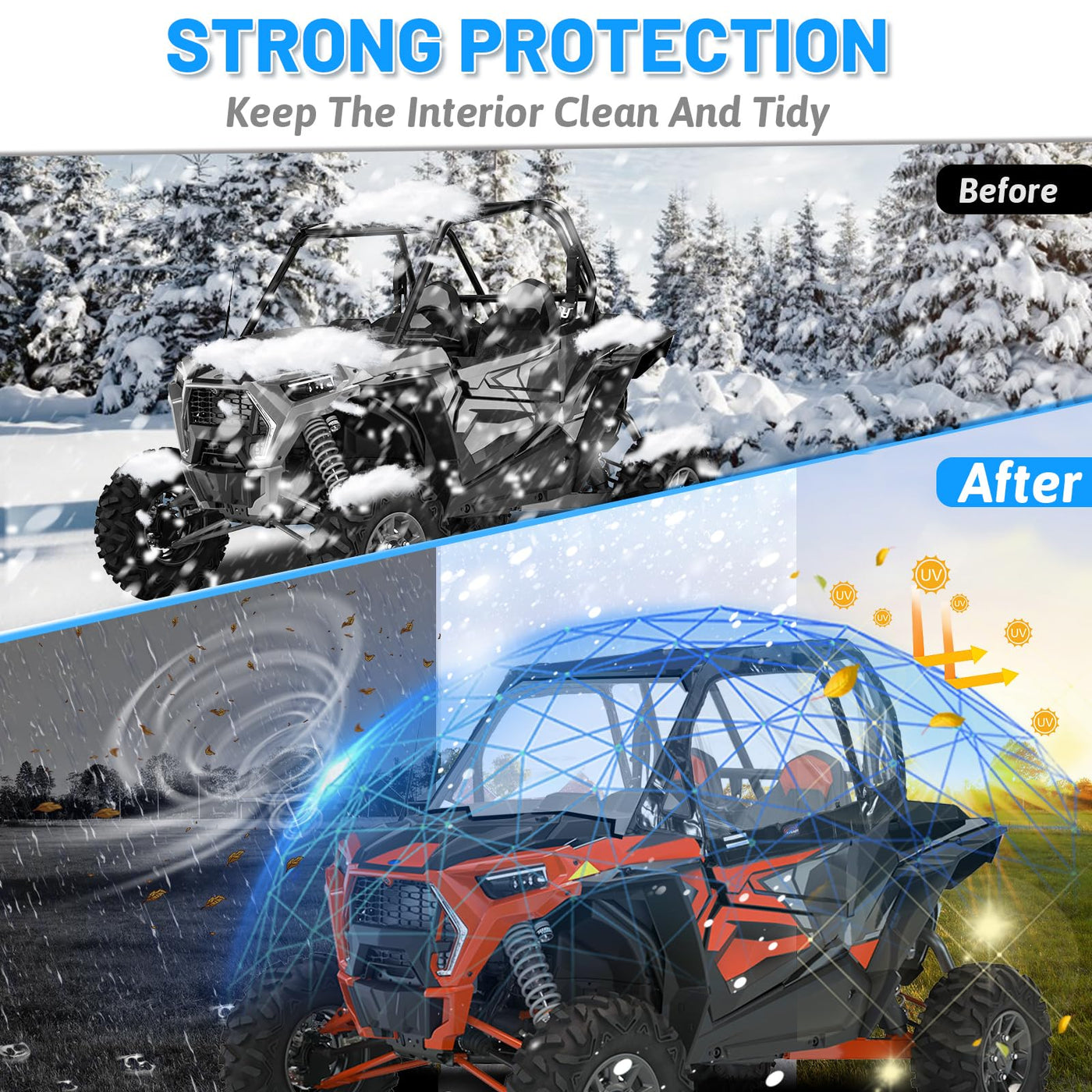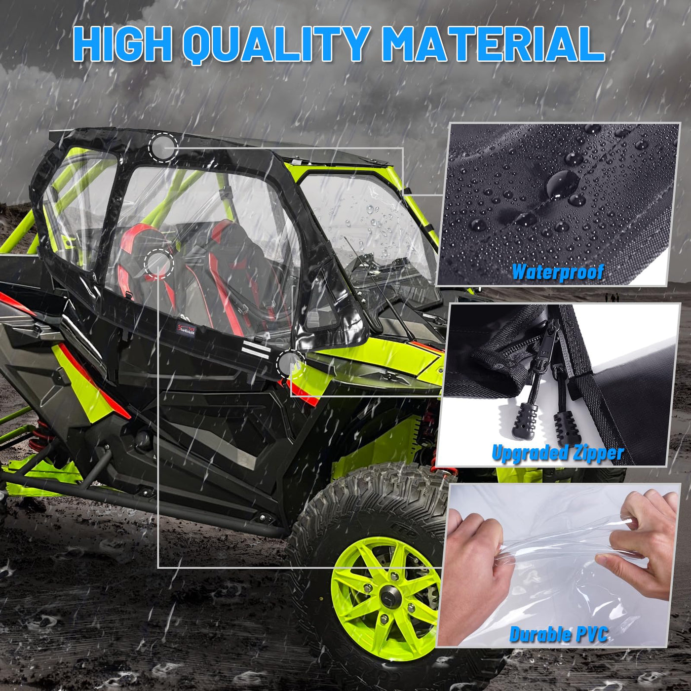 FITMENT: StarknightMT rzr soft upper doors is compatible with Polaris RZR XP 1000 2014-2023; RZR 900 2014-2019,RZR 900 XC 2015 2016; RZR S 900 2015-2019; RZR S 1000 2016-2019; RZR XP Turbo 2016-2021 DURABLE MATERIAL: StarknightMT rzr cab enclosure is made of high-quality clear PVC material and features waterproof, and puncture-proof, also does not easily turn yellow, and cleaning it is a breeze; The 1000 xp cab enclosure boasts an excellent Oxford fabric with a waterproof coating, which can block cold wind and rain greatly ZIPPER WINDOW DESIGN: The RZR soft upper door kit can be rolled down and fixed by straps to increase air circulation; Besides, after releasing the button at the bottom left corner of the rzr soft door and then pulling the zipper open to the top right corner, you can easily open the door to get in and out of the vehicle ALL YEAR PROTECTION: After rzr 1000 upper doors are installed, it can effectively prevent rain, snow, mud, sand, dust, leaves and other flying debris from entering cab to keep the interior clean and tidy; No matter what season it is, the rzr 900 soft upper enclosure always provides strong protection EASY INSTALLATION: It is easy to install RZR XP 1000 soft upper door enclosure, there is no any tool or drilling required; Wrapping around and sticking it on the door frame, installtion is completed.; You can use a hair dryer to heat it up and restore the adhesive force when the adhesive tape is not strong enough or flatten the PVC transparent film when it is wrinkled