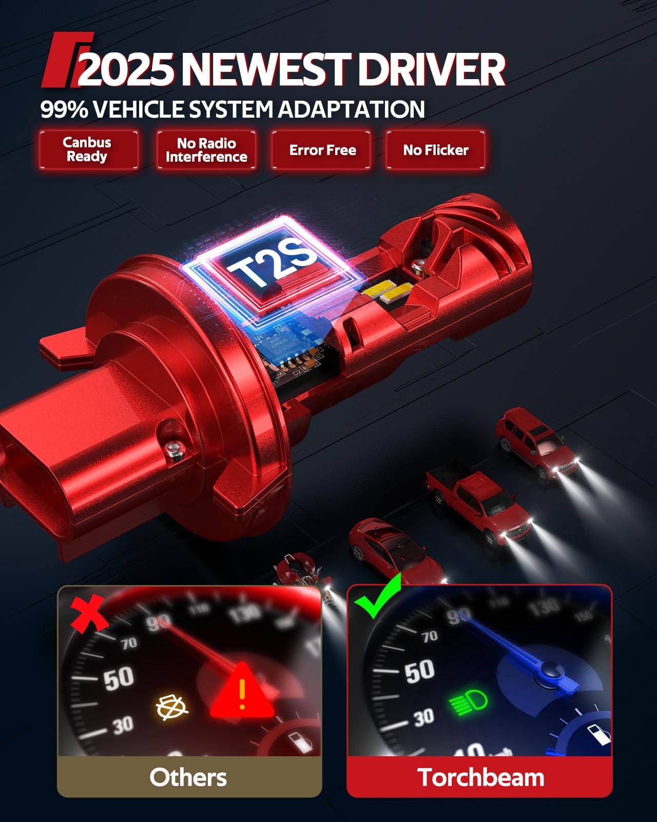 Perfect Light Type - Be Kind to Others: Our Torchbeam H13 fog bulbs are designed with precise optical engineering to ensure that the beam is focused on the road ahead and has a clear cut-off line, effectively avoiding light scattering or glare that may interfere with oncoming drivers. Whether on city roads or highways, you can enjoy clear and safe night driving while providing a friendlier environment for other road users | 2025 T2S Chip - Stable Performance, No Errors or Flickering: Torchbeam H13 bulb independently developed a new upgraded T2S chip, optimized driving circuit and current stability, which can provide stable and error-free lighting without flickering, dimming or sudden shutdown. Say goodbye to common lighting problems and ensure you get reliable performance every time you drive | 16000RPM Cooling Fan & Die-casting Aluminium Thermal Conductivity - 50,000h Continuous Lighting: The lamp bead package adopts the high-temperature resistant ceramic eutectic material in 2025, double-sided copper substrate and die-cast aluminum efficient thermal conductivity design, and T2S H13 bulbs equipped with a front 16000RPM high-efficiency cooling fan to ensure long-term lighting and constant temperature state, thereby extending the life of the bulb to 50000 hours | 1600-Foot Cold White Beam - Like Turning on the Sun at Night: The cold white beam extends up to 1600 FT longitudinally and covers 30 FT horizontally, with a color temperature of 6500K.These H13 bulbs combo lights unlike the yellowish hue of traditional stock bulb, the crisp cold white light enhances visual clarity. With its ultra-wide and long-range illumination, oncoming vehicles, road signs, and wildlife become significantly more visible, improving nighttime driving comfort and safety | Precise 1:1 Design - Install in Just 3 Steps and 3 Minutes: Featuring a 1:1 size ratio with traditional halogen bulbs, the compact, all-in-one design fits seamlessly into the housing without wobbling, even on bumpy roads. These Torchbeam H13 combo fog bulbs lights compatible with 99% of vehicles, installation is hassle-free: simply remove the dust cover, connect the power cable, and align the bulb with the socket. No tools, no stress