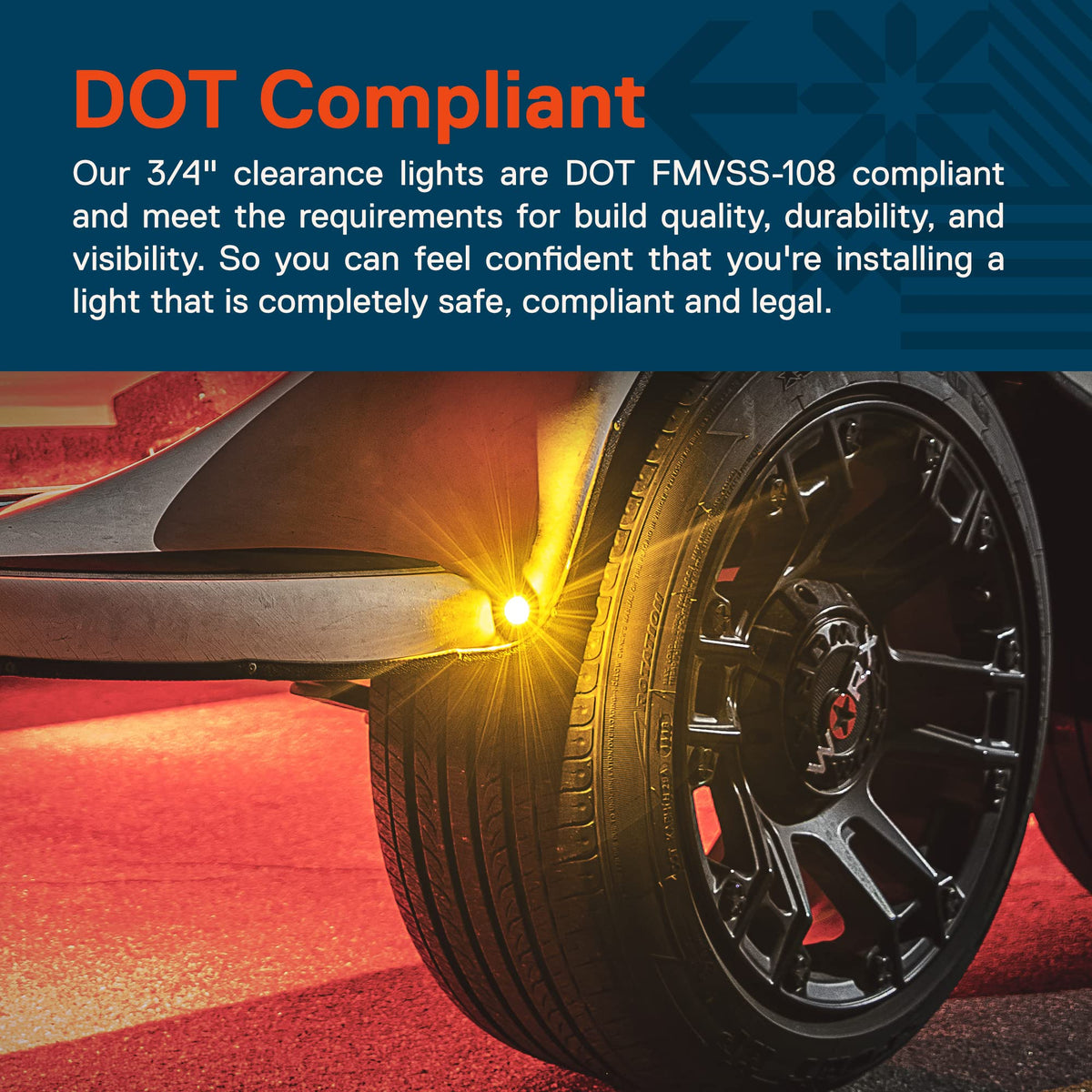 DOT COMPLIANT - Our 3/4'' clearance lights are DOT FMVSS-108 compliant and meet the requirements for build quality, durability, and visibility. So you can feel confident that you're installing a light that is completely safe, compliant and legal. | BETTER VISIBILITY - These lights are SAE P2 PC rated and produce a 180-degree visible arc of light. When installed on the 45-degree corner of a truck or trailer, they function as both a clearance and side marker light; two for the price of one! | MORE FUNCTIONS - Equipped with two brightness levels, these three-wire LED lights give you more options. Install them on the front or rear of your vehicle as side marker lights, clearance lights, auxiliary turn signals or supplemental brake lights. | FULLY SUBMERSIBLE - IP67 rated, these clearance lights are completely sealed, fully submersible, and designed to last longer than other, less reliable lights. That means fewer weather-related failures and more time in the schedule. | QUICK INSTALL - Time in the garage is time off the road. With a standard 3/4'' size, no-screw grommet install, and pre-attached .180'' bullet connectors, these lights install quickly and get you out of the garage and back on the road faster.