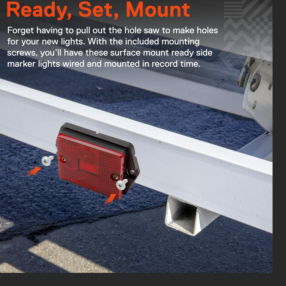 WHAT YOUR TRAILER DESERVESTrailers are how we work and how we play. And for those who haul there are just too many things to do before a long drive to waste time worrying about the trailer's marker lights. But if you're using short-lived incandescent bulbs, you could be making a trip to the parts store to fix your lights before you can hit the road. With a long-lasting set of LED clearance lights, you'll spend less time maintaining and more time doing what you love.DON'T SETTLE FOR SECOND BESTNot all clearance marker lights are created equal. Our lights sport an impressive IP67 waterproof rating needed for boat and jet ski trailers, have a notched back for easier wire routing, and come with top marking for easy orientation during installation. But just when you thought it couldn't get any better, these lights also come surface mount ready with hardware. No more needing to fight with the hole saw or scavenge through your bolts bin to get these bad boys on, could it get easier than that?MORE THAN JUST AN LED LIGHTMore than just practical and long-lasting, our lights are also legal. According to the FMVSS-108, all trailers over 80'' wide must use clearance lights and reflective materials to legally operate on the road. Our lights combine the features and benefits of an LED side marker with a highly visible reflective lens so you can quickly and easily satisfy both requirements with one piece of equipment.FeaturesDOT FMVSS-108 ApprovedSAE AP2 RatedIP67 Waterproof (Submersible)Reflector Lens DesignSurface Mount w/ Hardware What's Included?(4) 3'' x 2'' Surface-Mount Clearance Marker Light(4) Pack of Mounting Screws