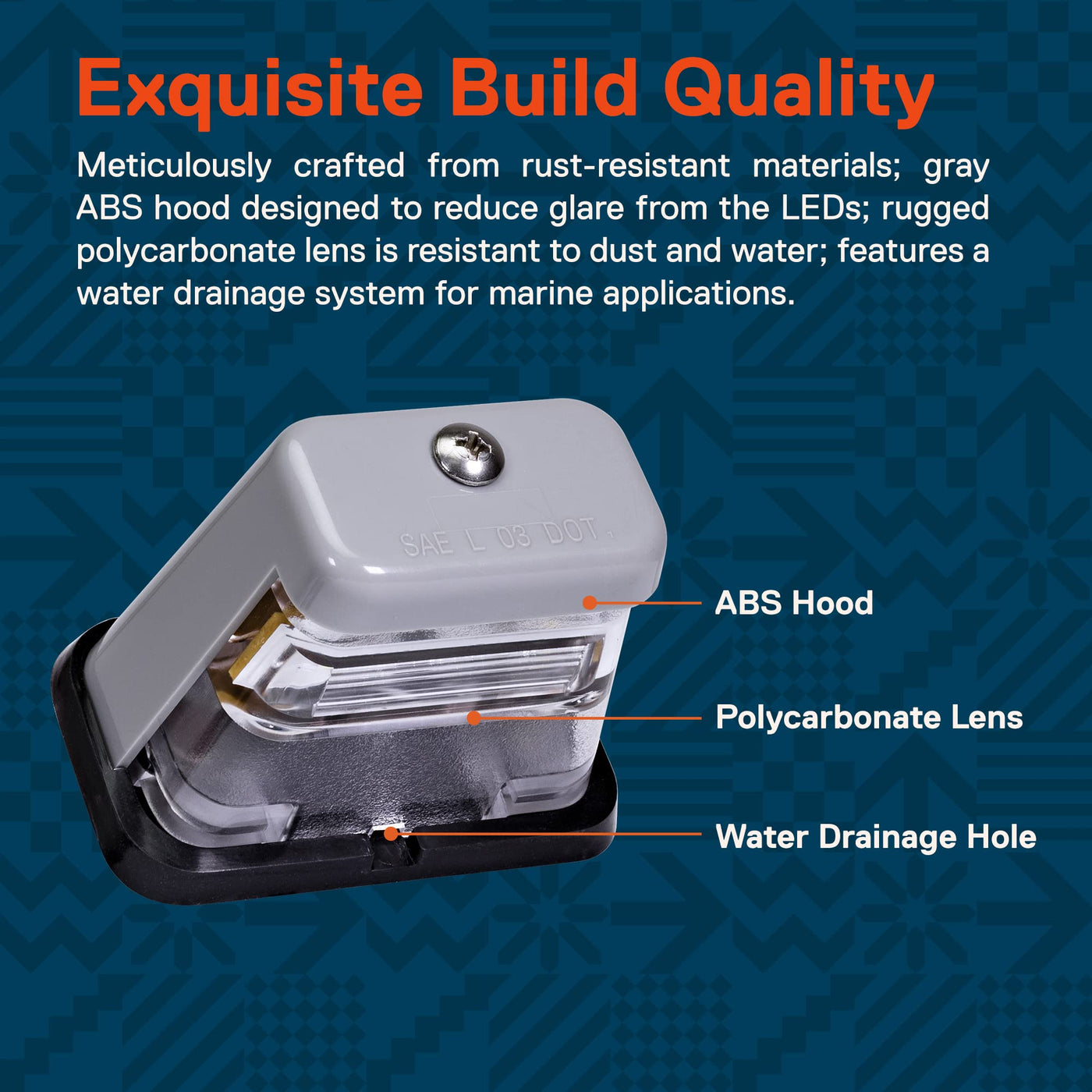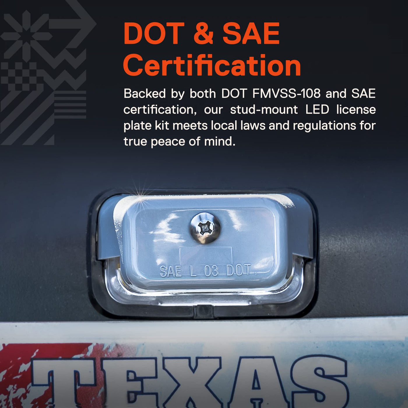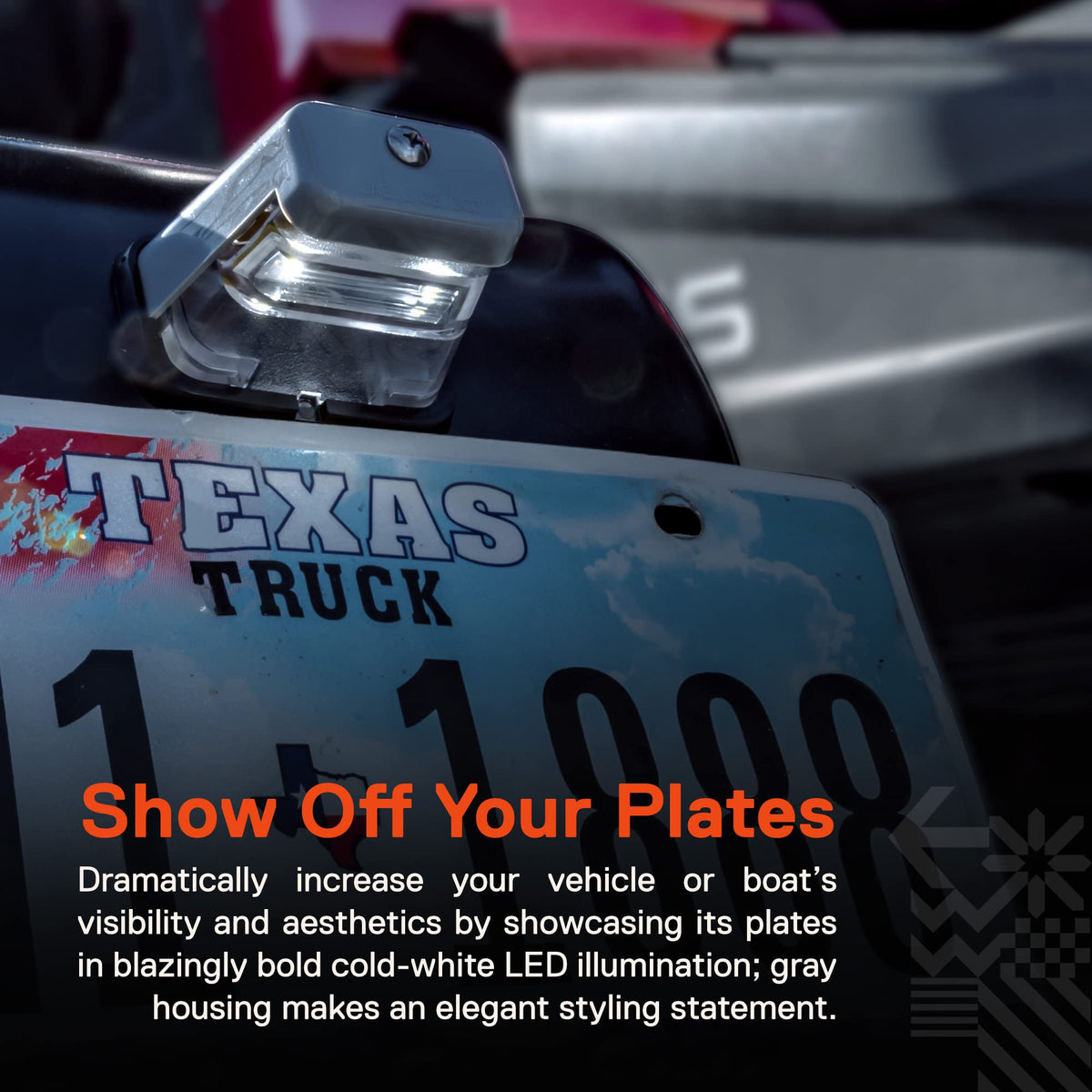 ILLUMINATE YOUR PLATES - Dramatically increase your vehicle or boat's visibility and aesthetics by showcasing its plates in blazingly bold cold-white LED illumination; gray housing makes an elegant styling statement. | SECURE STUD-MOUNTING - Bolts directly into the studs located in your vehicle or vessel's license plate for solid, secure mounting. | IP67 WATERPROOF RATED- Fully - Submersible, waterproof design protects the kit from water damage; excellent LED license plate light for all-weather driving and marine vessels like boats and personal watercrafts. | LEGENDARY BUILD QUALITY - Meticulously crafted from rust-resistant materials; gray ABS hood designed to reduce glare from the LEDs; rugged polycarbonate lens is resistant to dust and water; features a water drainage system for marine applications. | DOT & SAE CERTIFIED - Backed by a DOT FMVSS-108 Certification, our stud-mount LED license plate kit abides by local laws and regulations for added peace of mind.