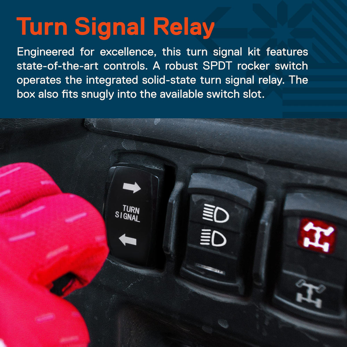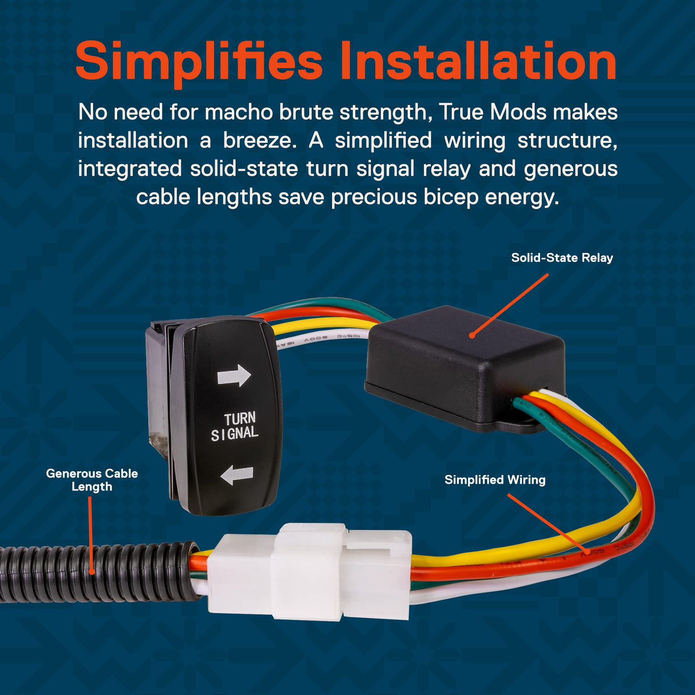 Road Ready Warrior UTV/ATVsUTVs and ATVs are fantastic rock crawlers, but it can be a pain to haul them to a dirt paradise. With the turn signal kit from True Mods, add street legality to the vehicles in most U.S. States! Be a family hero and drive your vehicle to excursions after a painless install! The integrated solid-state turn signal relay eliminates the pain of routing wires to an external relay. Generous cable lengths also give leeway.Miracle Engineering w/ Best FeaturesAfter seeing the stellar engineering of our turn signal kit, you'll start believing in miracles. A robust SPDT rocker switch fits perfectly to the vehicle's switch slot. No one likes a mess; you don't have to be sweat and DIY to improve cable management. Our kit miraculously features a stout joint connection, premium wire outlet reinforcement, a superior wire loom and 18 AWG wiring! Installs Onto the Best RidesThis plug-n-play turn-signal kit takes any UTV or ATV to the next level because of its universal fitment. The Polaris RZR, Can-AM X3, Kawasi, Honda Pioneer and more can hit the streets and brightly signal while turning!NOTE: the kit is NOT compatible with the tail or other original vehicle lights.FeaturesUniversal fitSPDT Rocker switch controlBetter cable managementEasy install What's Included?EPSCBL0251A1-Wiring Harness for EPSCBL0251 Turn Signal KitEPSCBL0251A2-Accessories Pack for EPSCBL0251 Turn Signal KitEPSCBL0252A1-Cable Tie Accessories Pack for EPSCBL0252 Turn Signal KitEPSCBL0252C1-Control Switch with Built-In Turn Signal RelayInstruction Manual-Instruction Manual
