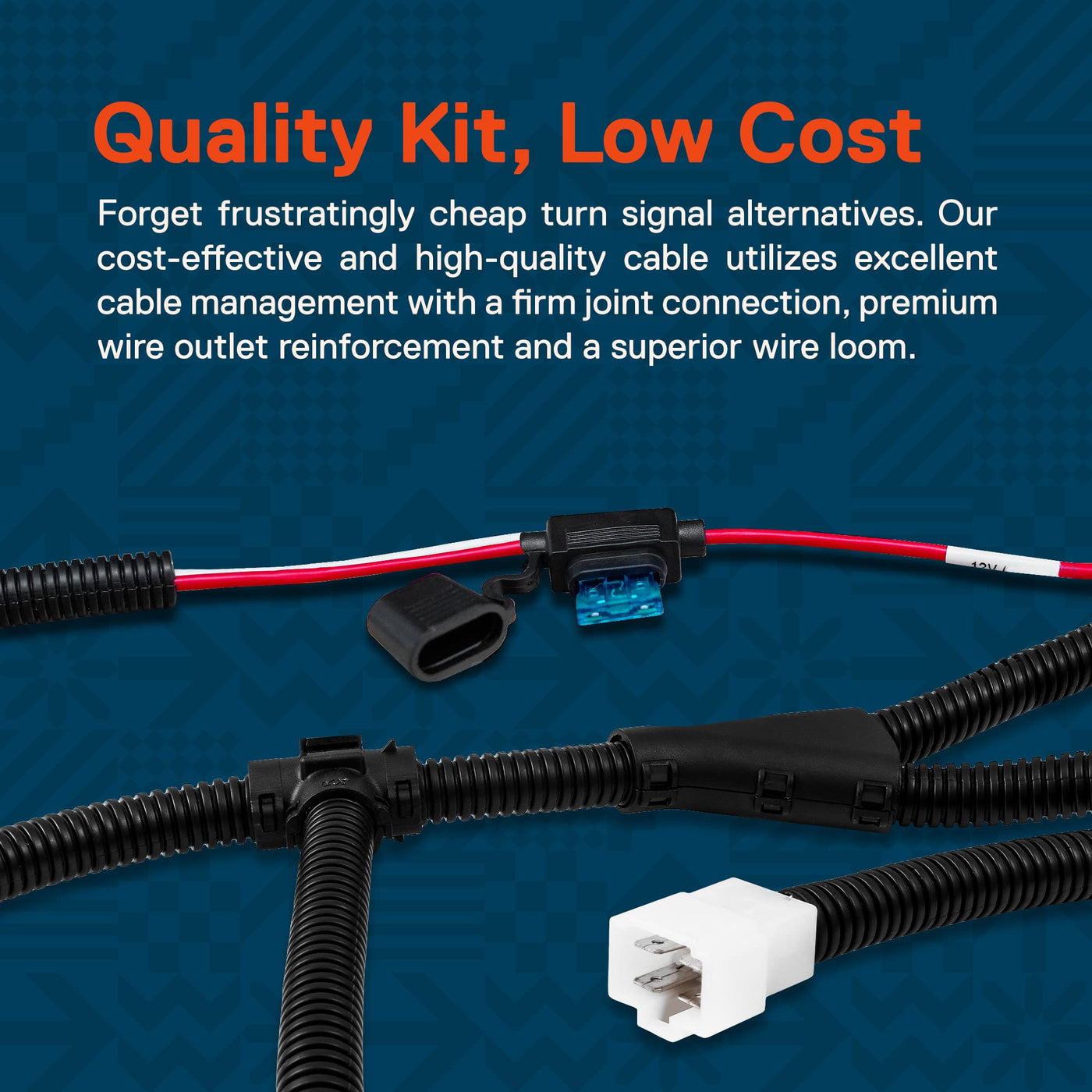 Q: What materials are used in the turn signal kit for durability?A: The True Mods turn signal kit is constructed with high-quality materials, including premium wire outlet reinforcement and an exceptional wire loom. The robust joint connection and 18 AWG wiring ensure durability and reliability for long-lasting performance in various conditions.
