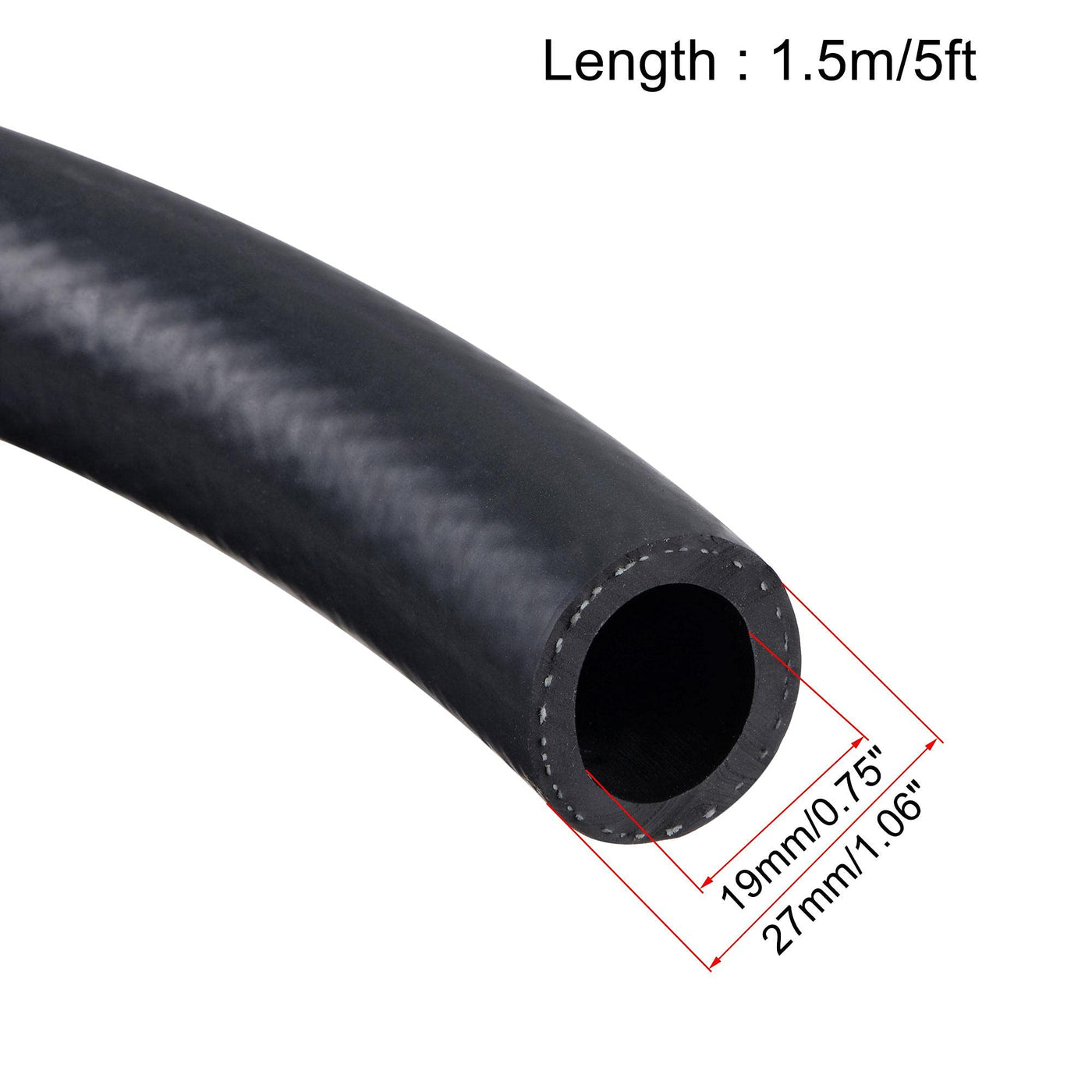 Q: What are the dimensions of the fuel line hose?A: This fuel line hose has an inner diameter of 3/4" (19mm), an outer diameter of 1 1/16" (27mm), and a length of 5ft (1.5m).