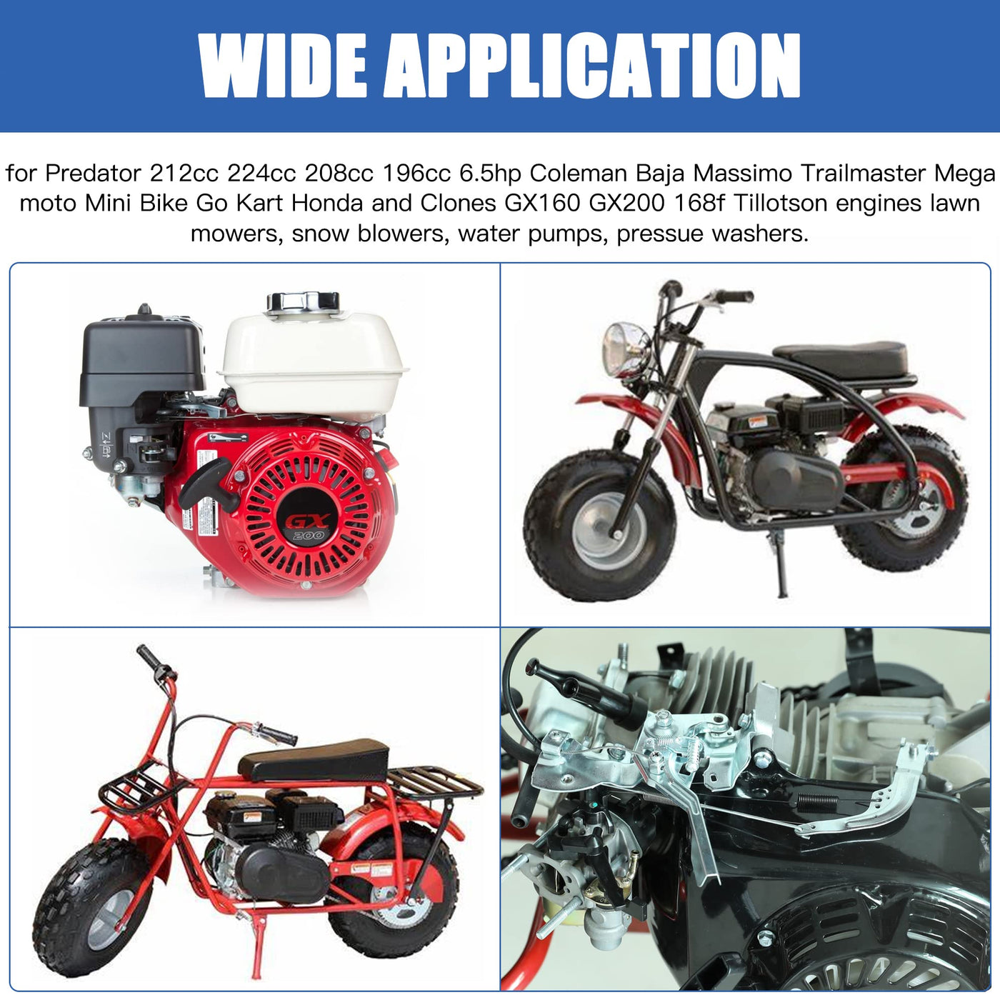 YOXUFA Throttle Control Spring Assembly Kits for Predator 212cc 196cc Coleman CT200U BT200X KT196 Baja Warrior MB200 MB165 Mini Bike GX160 GX200 6.5hp Engine Go Kart Performance Parts Product details Features: For Honda and Clones GX160 GX200 168f 6.5hp 196cc Predator 212cc 224cc Tillotson engines lawn mowers, snow blowers, water pumps, pressue washers etc Coleman Baja Massimo Trailmaster Mega moto Monster Motorsprots Mini Bike Go Kart. Compatibility: Predator Hemi / Non-Hemi 212cc Engine, Coleman Powersports CT200U / CT200U-EX / BT200X / KT196 /RB200, Hond* GX200 6.5HP GX160 5.5HP GX1405.0HP OHV engine, Baja Motorsports Mini Bike MB165 & MB200 (Heat, Mini Baja, Warrior), TrailMaster Buggy Interceptor MB200-1 ,MB200-2, Monste* Moto / Mega Moto Mega Max MM-B212MX,MM-B212PRO, This is a throttle control assembly kits with governor control base, throttle return springs, speed control spring and governor rod for Honda and clones engine cable linked throttle control adjustment. Thease throttle control assembly kit are made of superior metal material, which is sturdy and spring is flexible. It's easy to install ,There are installation steps in the pictures for reference Please check the size and pictures carefully and compare with your original part to make sure it's fit. ? Specification: Part Name : Throttle Control Assembly Kit Brand: YOXUFA Material: Metal Package Size: 14X15X5cm / 5.5X5.5X1.96 in Package Weight: 0.24kg / 8.46oz Package Include: 1* Governor Control Base, 2* Throttle Return Springs, 2* Speed Control Springs, 2* Governor Rod, 1* Spark Plug,