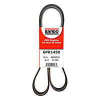 Q: What vehicles is the Bando USA 6PK1450 OEM Quality Serpentine Belt compatible with?A: The Bando USA 6PK1450 Serpentine Belt is designed to fit a wide range of vehicles, specifically those that require a belt with 6 ribs and a length of 1450 mm (57.1 inches). It is suitable for both OEM and aftermarket applications, ensuring a perfect fit for various makes and models.