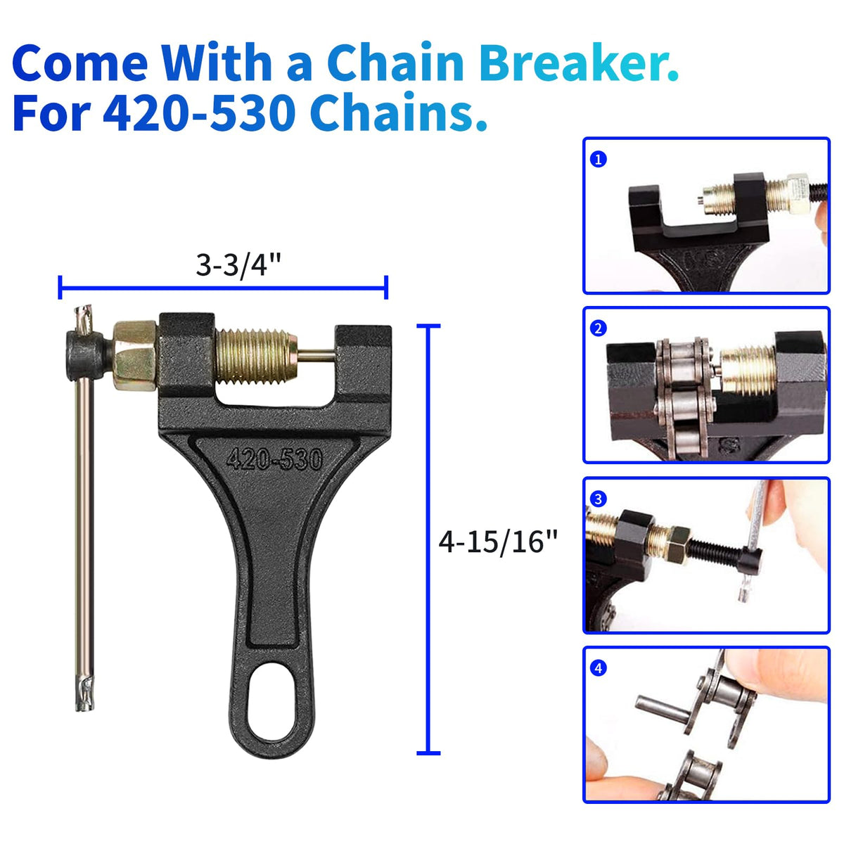 Heavy-duty 420 Chain 90 Link with Chain Breaker & 5 Connecting Links Specifications: Chain No.: 420 Pitch: 1/2'' Roller Width: 1/4'' Roller Diameter: 5/16'' Sprocket Thickness: 0.227'' Chain total length 44.92'' in 90 links Color: Silver Material: Alloy Steel This 420 chain for mini bike is compatible with: Cole man Powersports CT200U, CT200U-EX, CT200U Trail, BT200X Baja Motorsports Mini Bike MB165, MB200 (Heat, Mini Baja, Warrior) Hensim Mini Bike MB165, MB200 (Heat, Mini Baja, Warrior) Massimo/TrailMaster MB200 Axis M200 Tomberlin Firehawk 6.0 Hp Tao Tao DB24 Dirt Bike 110cc Ka wasaki KLX110 2010-2020 110cc, KLX110L 2010-2020 110cc Yama ha Big Wheel 80 1986-1990 80cc, TTR110E 2009-2023 110cc, YZ50 1980 50cc Note: The Baja Mini Bike uses two chains, a shorter 42 link and this 90 link. Please make sure which chain you need. Proper Lubrication Before starting, gather a chain cleaner, lube, rag, and chain brush. Thoroughly clean the chain before lubrication. Apply a gentle spray to the sprocket teeth contact area, allowing the chain to complete one full revolution. Lightly spray the outer panels during another revolution, then cover the inner side panels on a subsequent revolution. Avoid excessive lubricant, as it can attract dirt and become abrasive, causing premature wear and undermining the lubrication's effectiveness. Chain Installation ? Attach the new chain to the end of the old one with a new connecting link. Turning the rear wheel will bring the new chain into position. ? When replacing a fresh chain, connect both ends with a new connecting link. We recommend lubricating the new connecting link. ? For clip-type connecting links (FJ, RJ), place the open end opposite the chain driving direction. ? Adjust the chain according to the motorcycle maker's instructions. Package Includes: 1 420 Chain 90 Link 1 Chain Breaker 5 Connecting Master Links