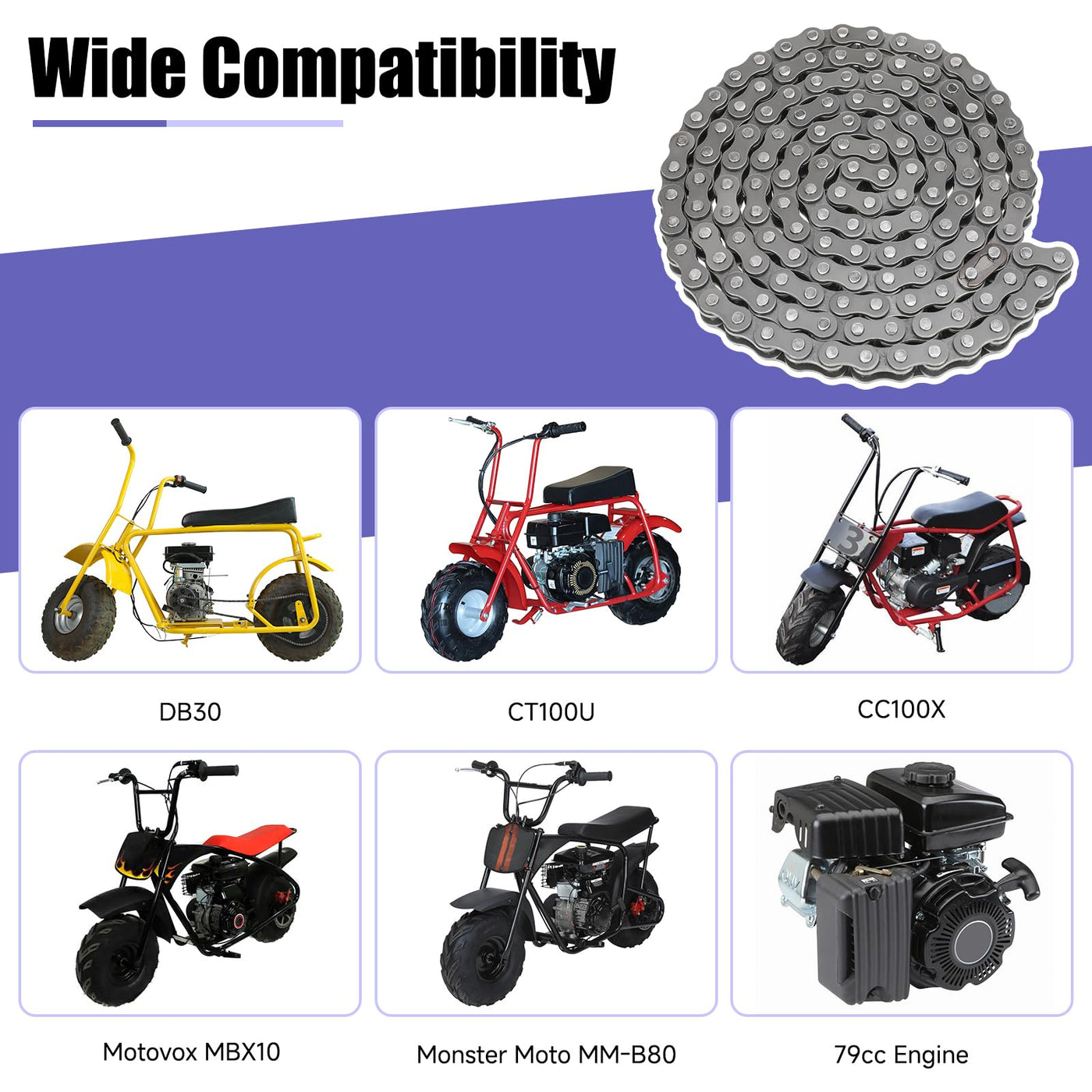 Product details Compatibility: 35 Chain Replacement for Coleman Baja Motovox Mini Bike with Predator 79 cc 212 cc 97 cc 98 cc 100 cc Engine Coleman Powersports CT100U CC100X Mini Bike Baja Motorsports Doodle Bu* DB30 (Blitz, Dirt Bu*,Viper) Mini Bike Motovox MBX10MBX11 Mini Bike Monster MotoMega Moto Classic 80 cc MM-B80105 cc MM-B1051000w Electric Mini Bike Premium Quality Material 35 chain for mini bike is made of durable and premium quality alloy steel, its surface has exceptional wear and corrosion resistance, effectively prolonging the life of the chain Points To Note: Come with chain breaker and extra chain master link to help you better complete the disassembly and installation work Specification: Part Name : 35 Chain 140 Link Chain Breaker Brand: CILOYU Material: Metal Package List: 1 * 35 Chain 140 Link, 5 * 35 Chain Master Links 1 * Chain Breaker